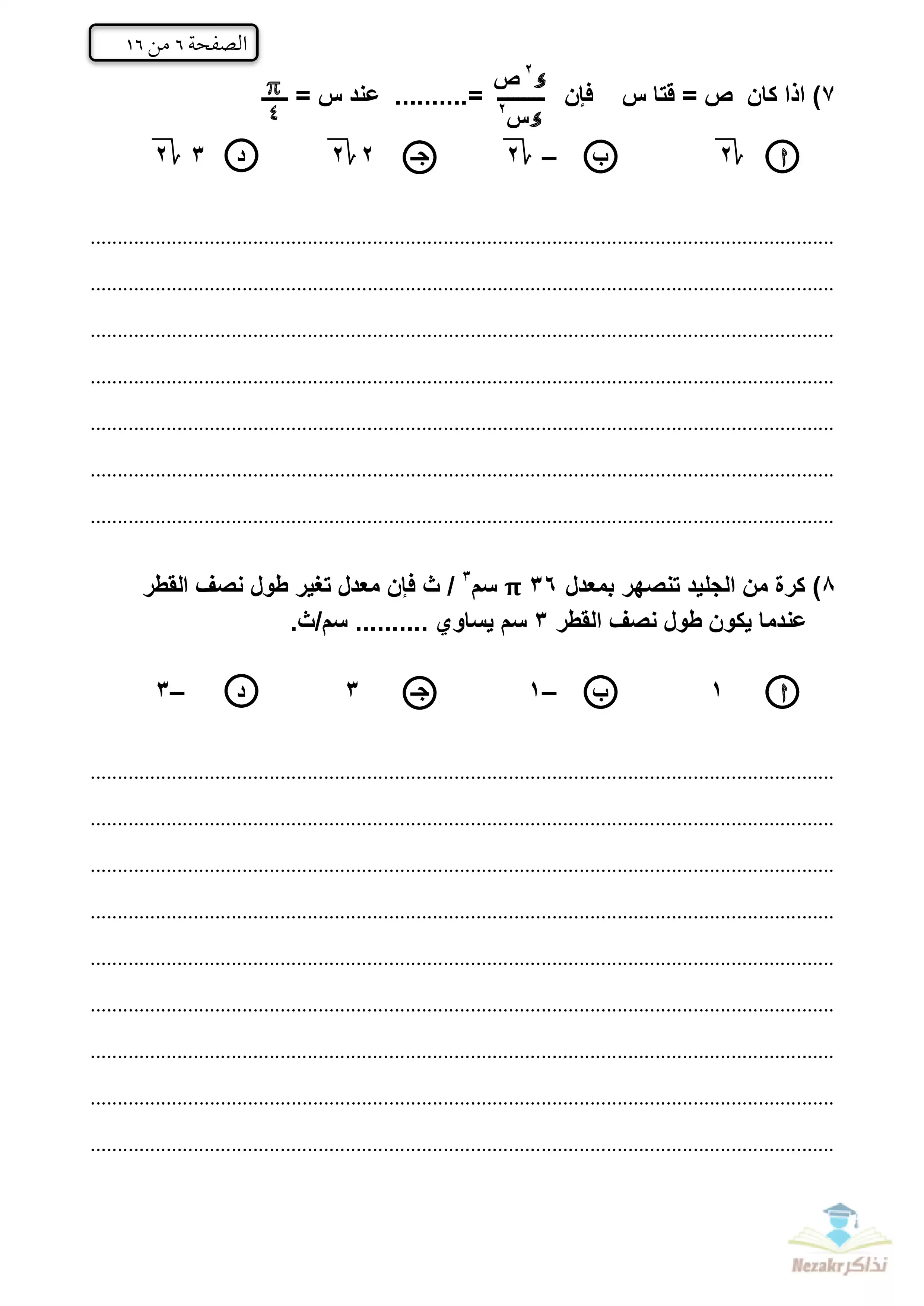 صفحة 6 من 16 صفحة من ملف: الامتحان التجريبي في التفاضل والتكامل للشهادة الثانوية الأزهرية 2023 - Nezakr