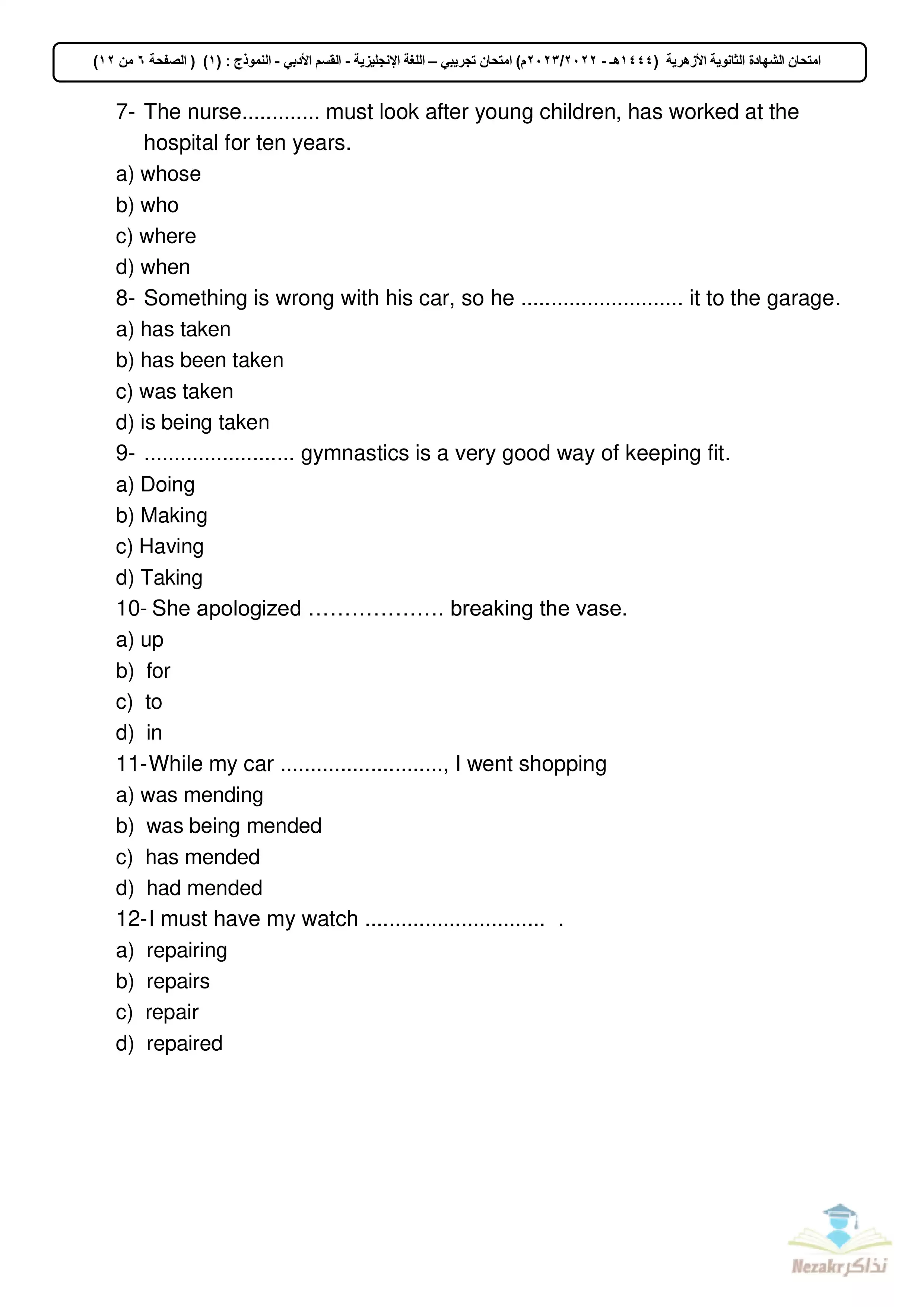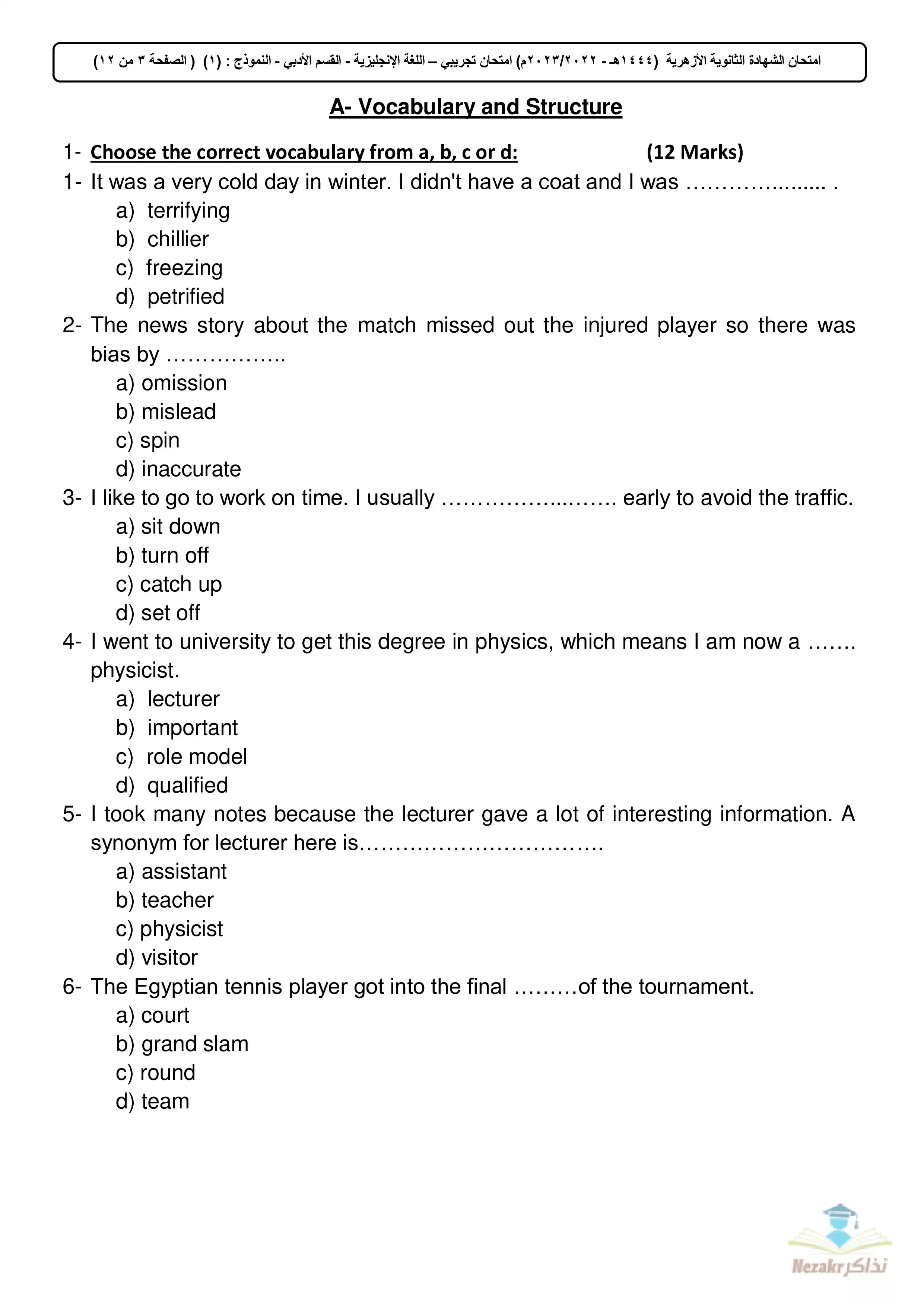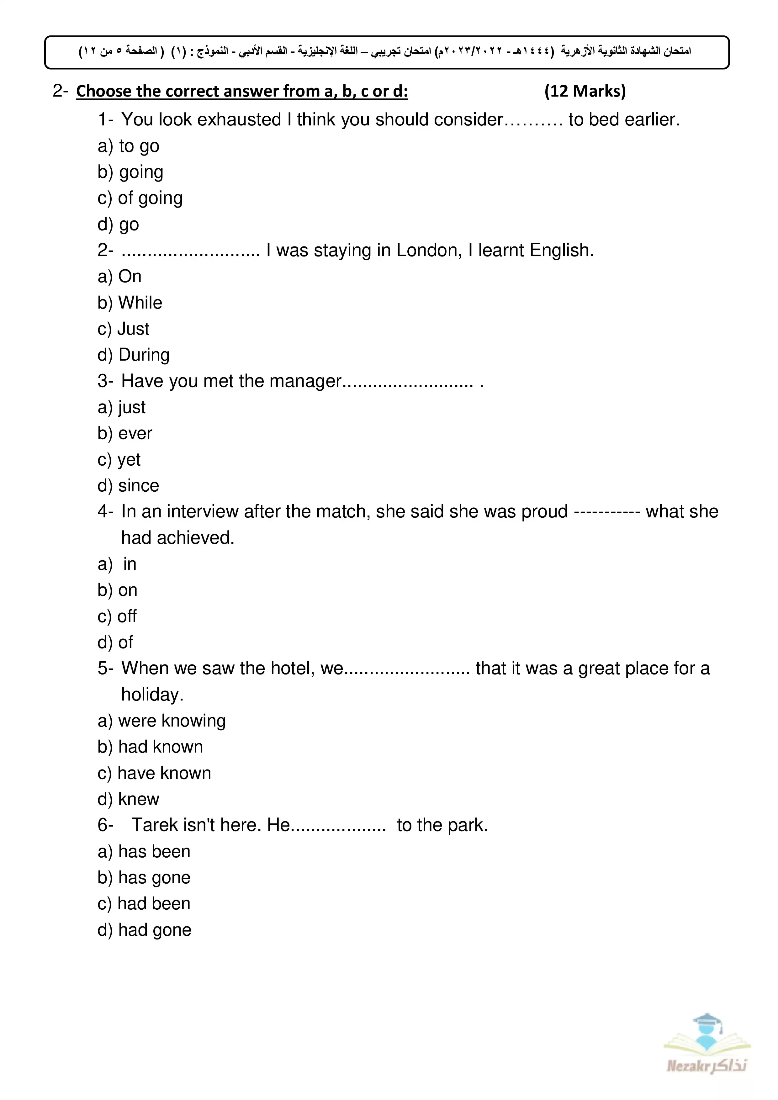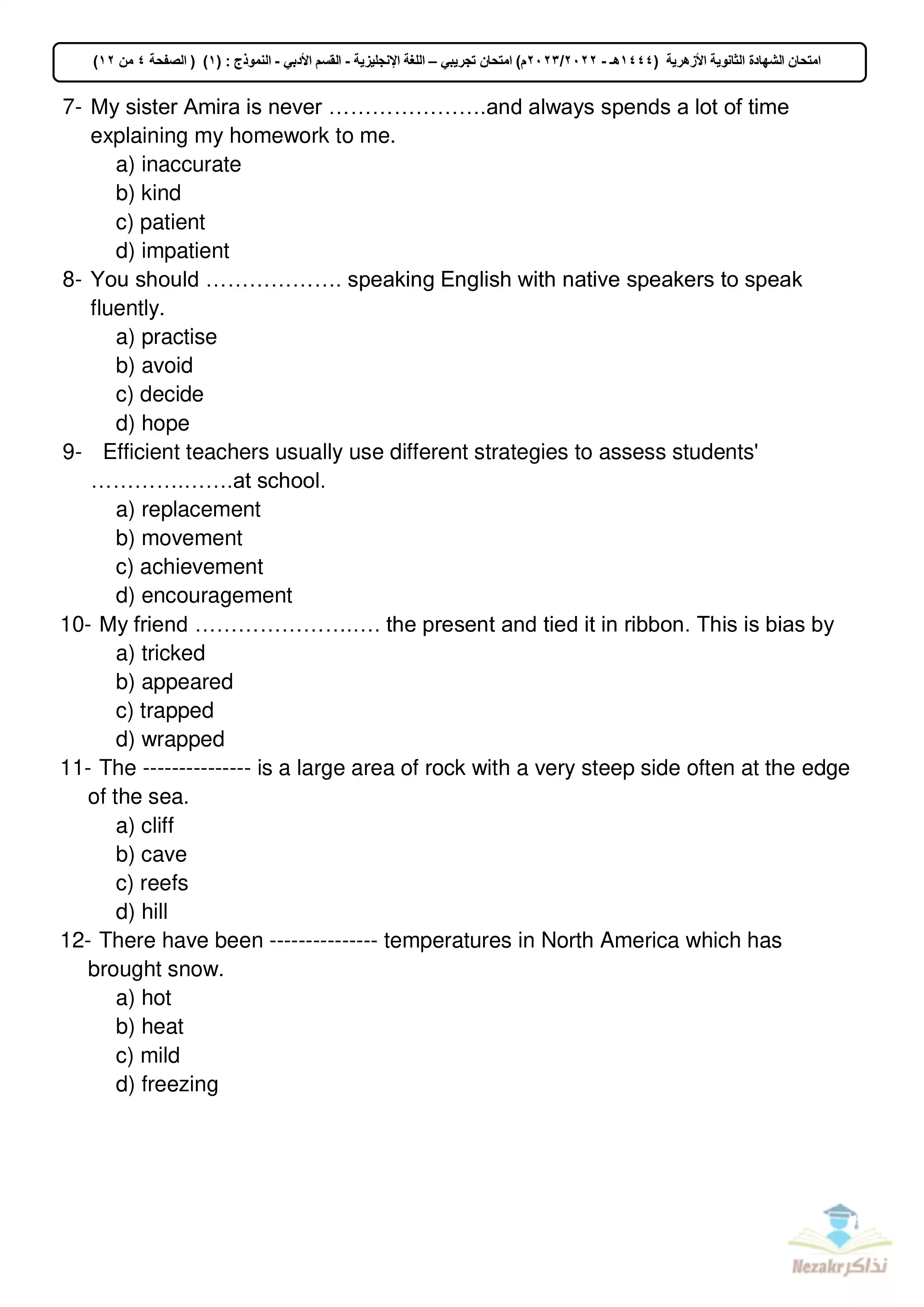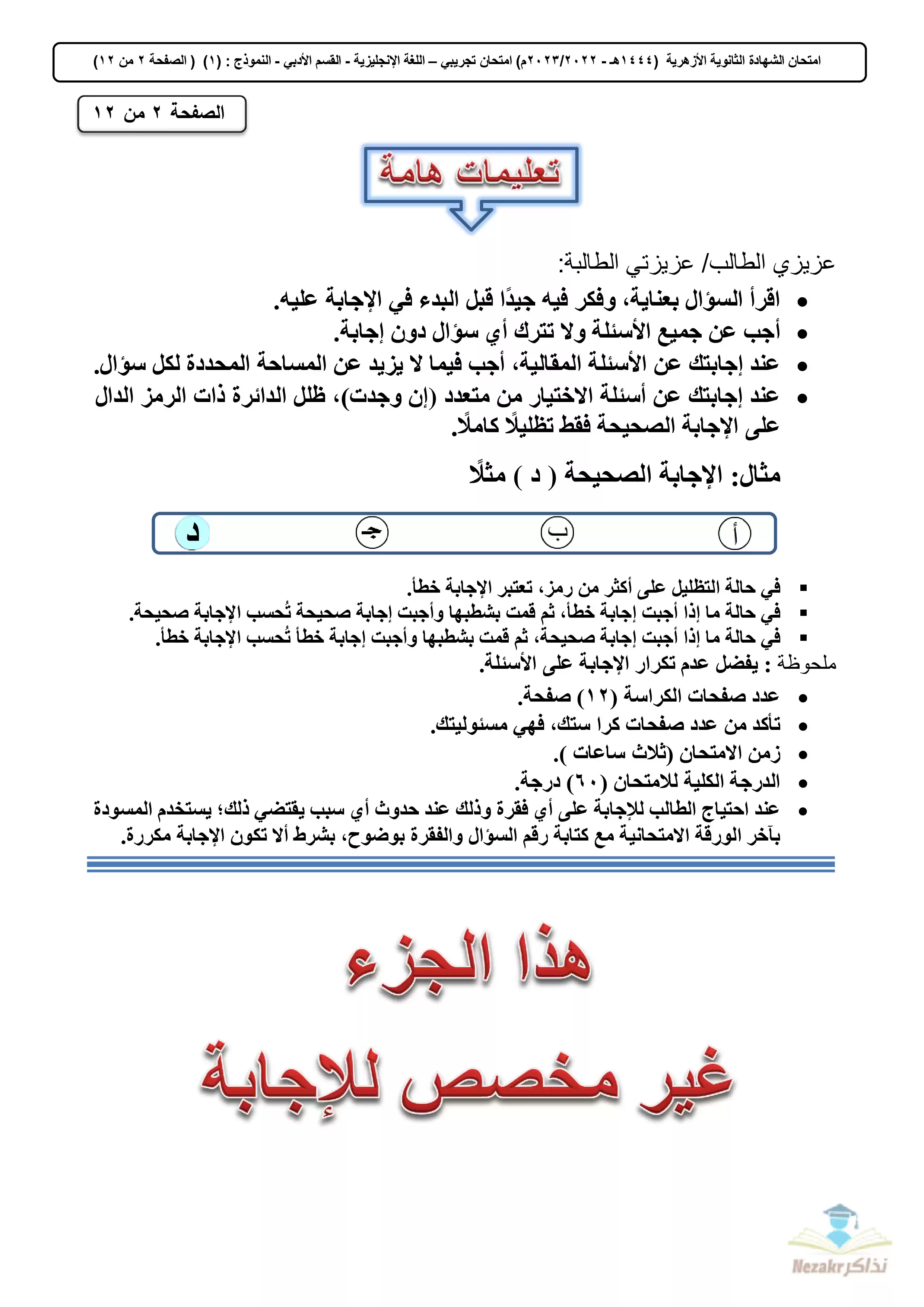| بيانات الملف: (الامتحان التجريبي في اللغة الإنجليزية للأدبي للشهادة الثانوية الأزهرية 2023 - Nezakr) | |