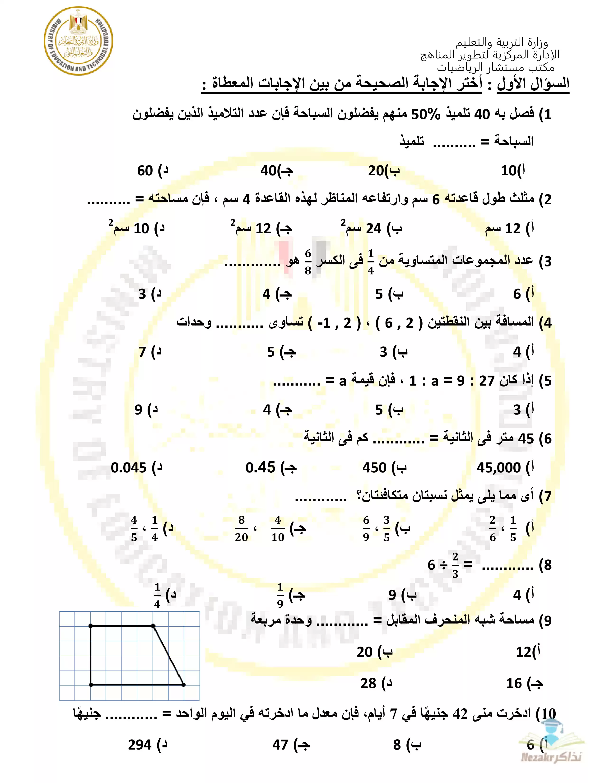 صفحة 1 من 9 صفحة من ملف: تمارين وزارة التربية والتعليم الاسترشادية في مادة الرياضيات لفئات الدمج للصف السادس الابتدائي الفصل الدراسي الثانى
