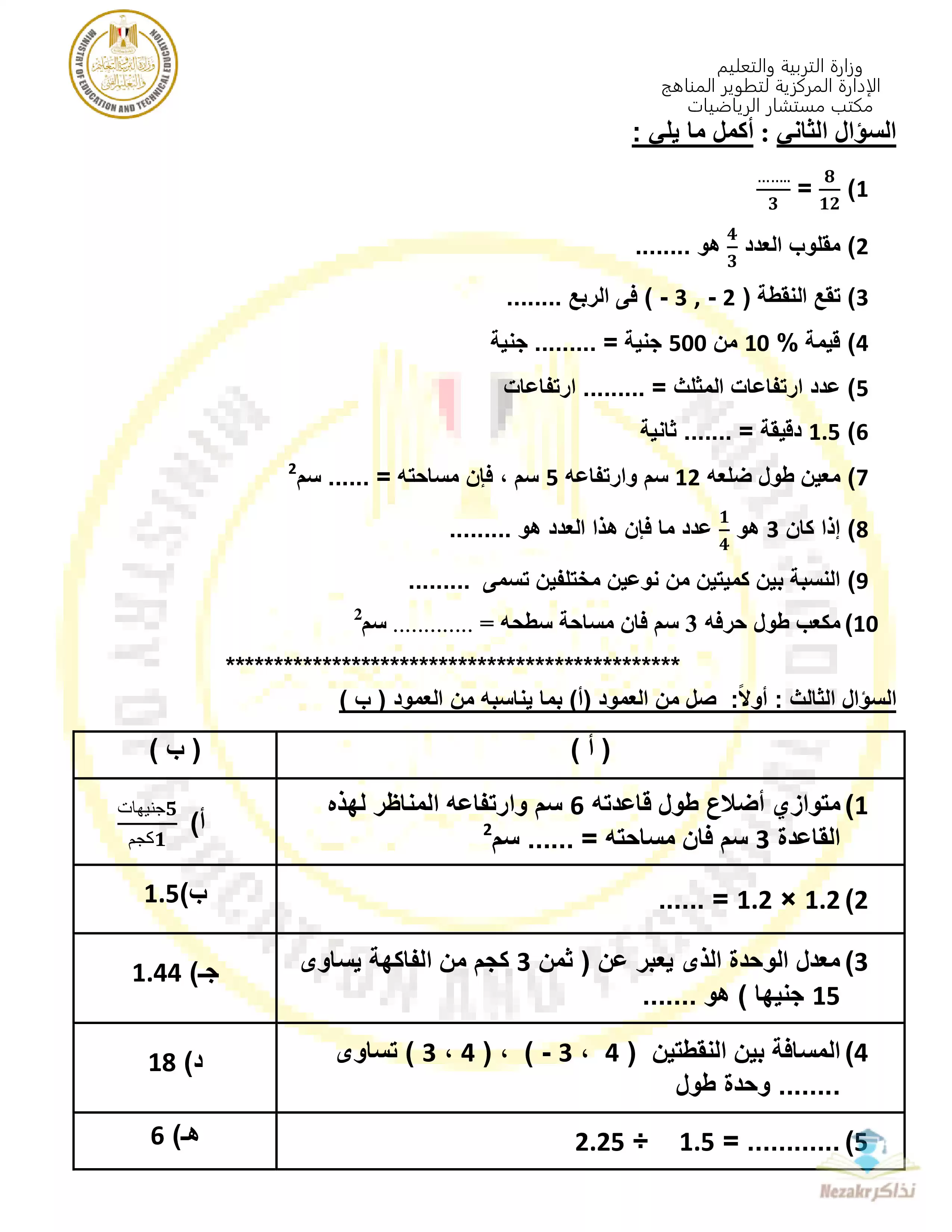صفحة 3 من 9 صفحة من ملف: تمارين وزارة التربية والتعليم الاسترشادية في مادة الرياضيات لفئات الدمج للصف السادس الابتدائي الفصل الدراسي الثانى
