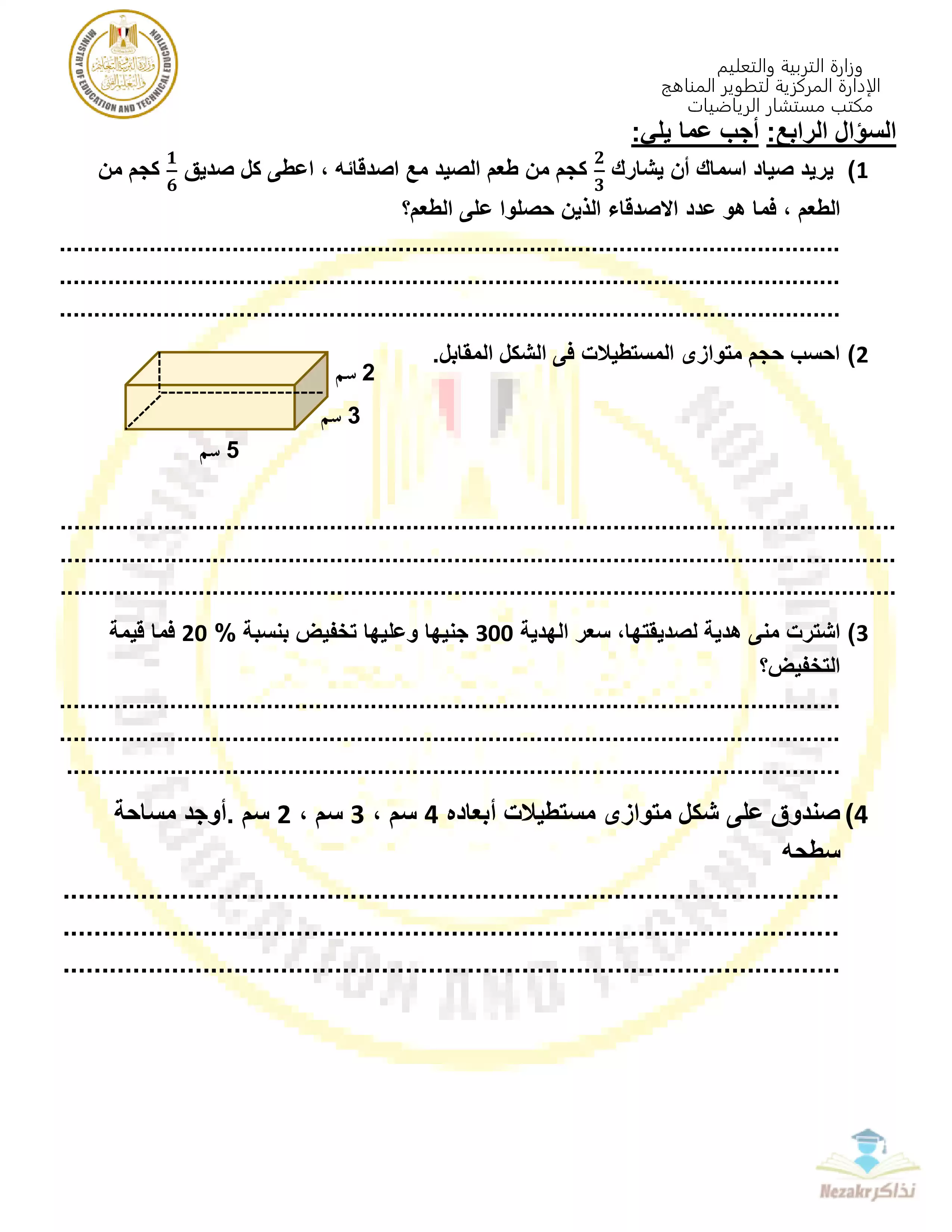 صفحة 4 من 9 صفحة من ملف: تمارين وزارة التربية والتعليم الاسترشادية في مادة الرياضيات لفئات الدمج للصف السادس الابتدائي الفصل الدراسي الثانى