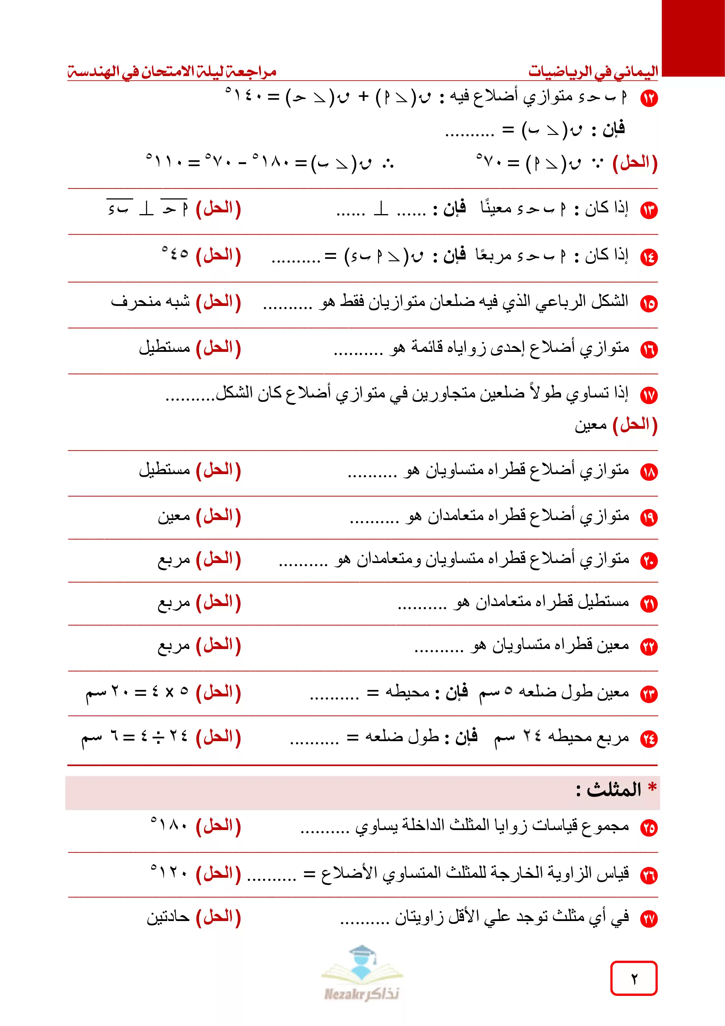 صفحة 2 من 12 صفحة من ملف: مراجعة ليلة الامتحان في الهندسة للصف الأول الإعدادي الفصل الدراسي الثاني - Nezakr