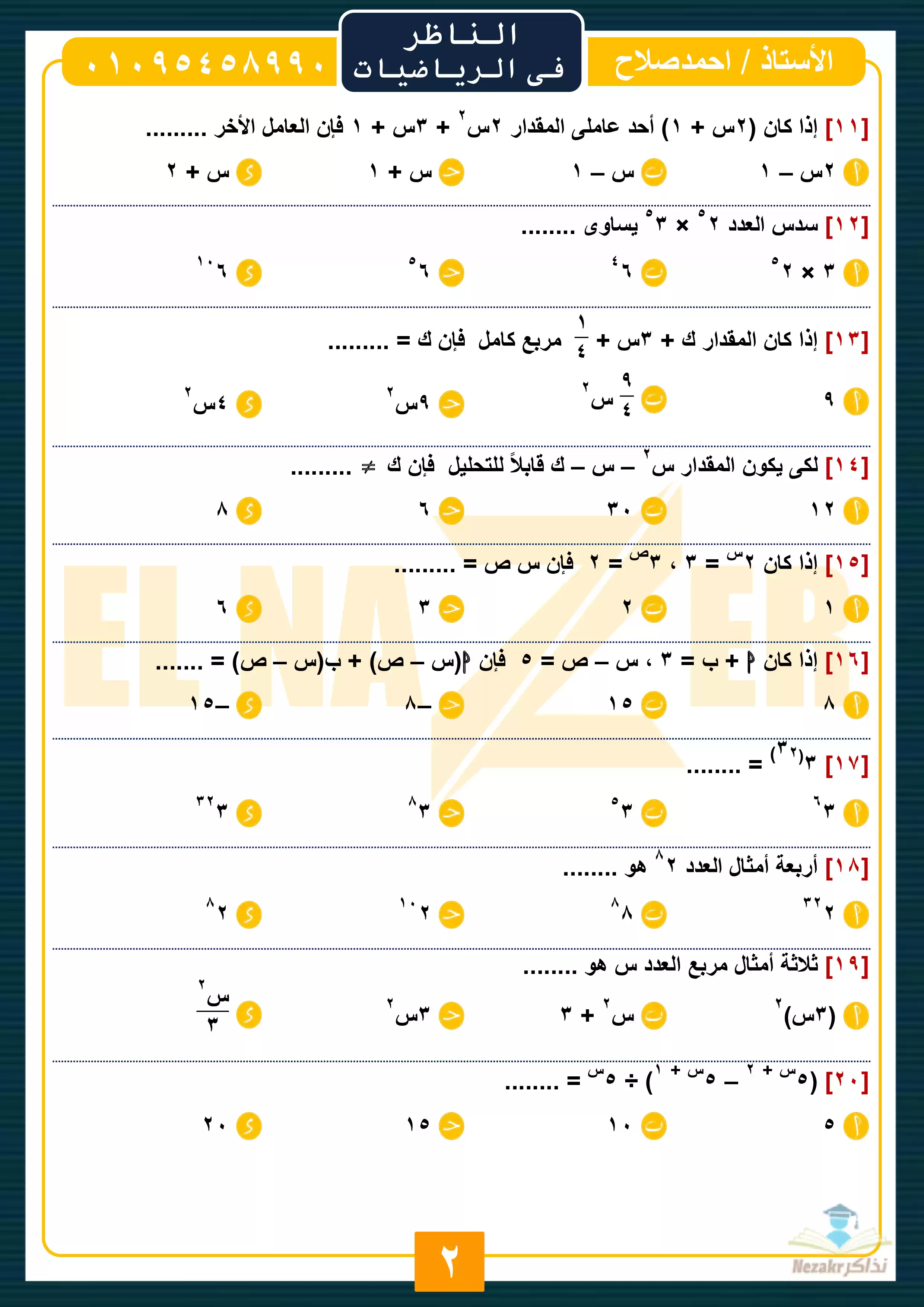 | بيانات الملف: (المراجعة النهائية في الجبر للصف الثاني الاعدادي الترم الثاني (سلسلة الناظر) - Nezakr) | |