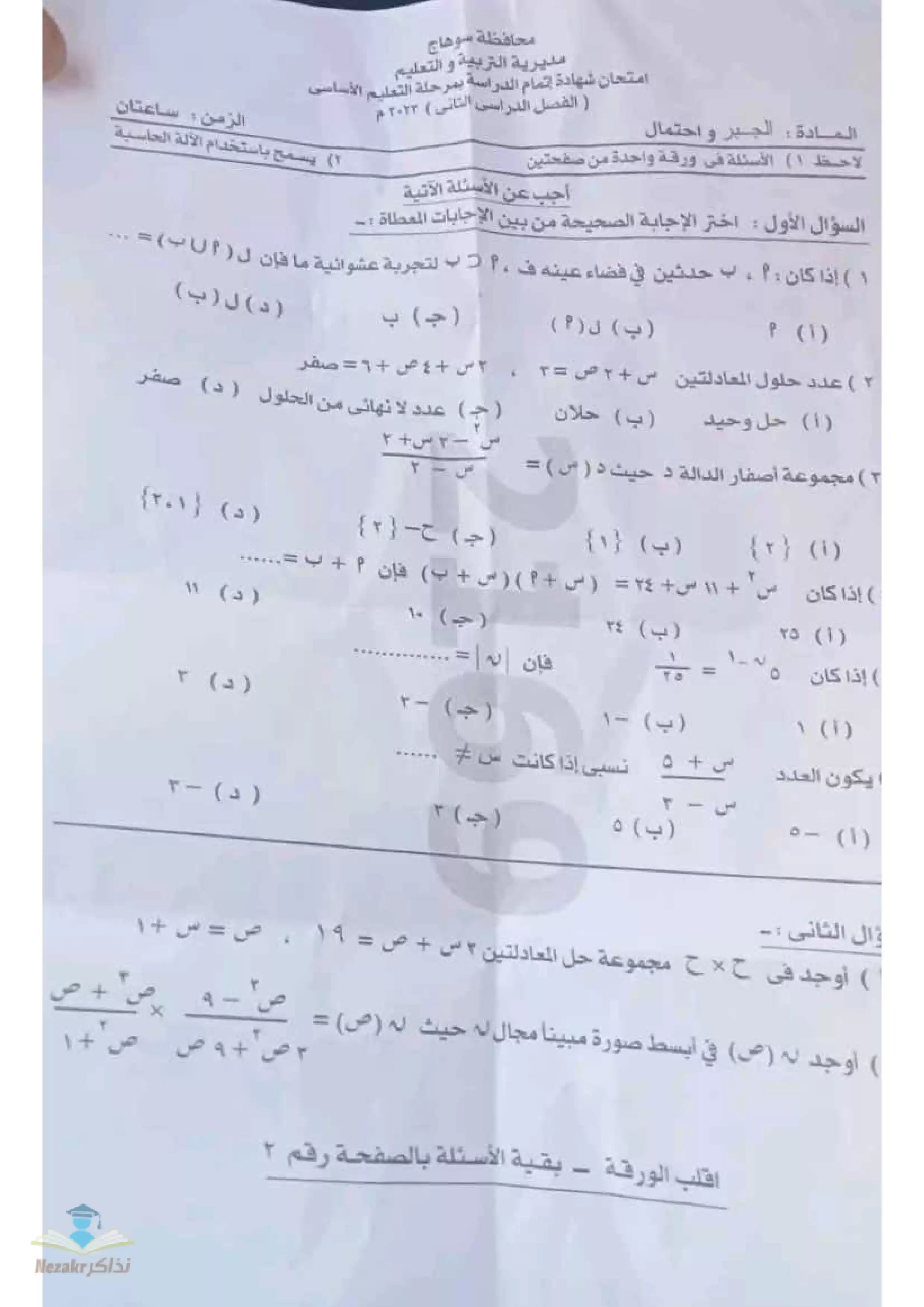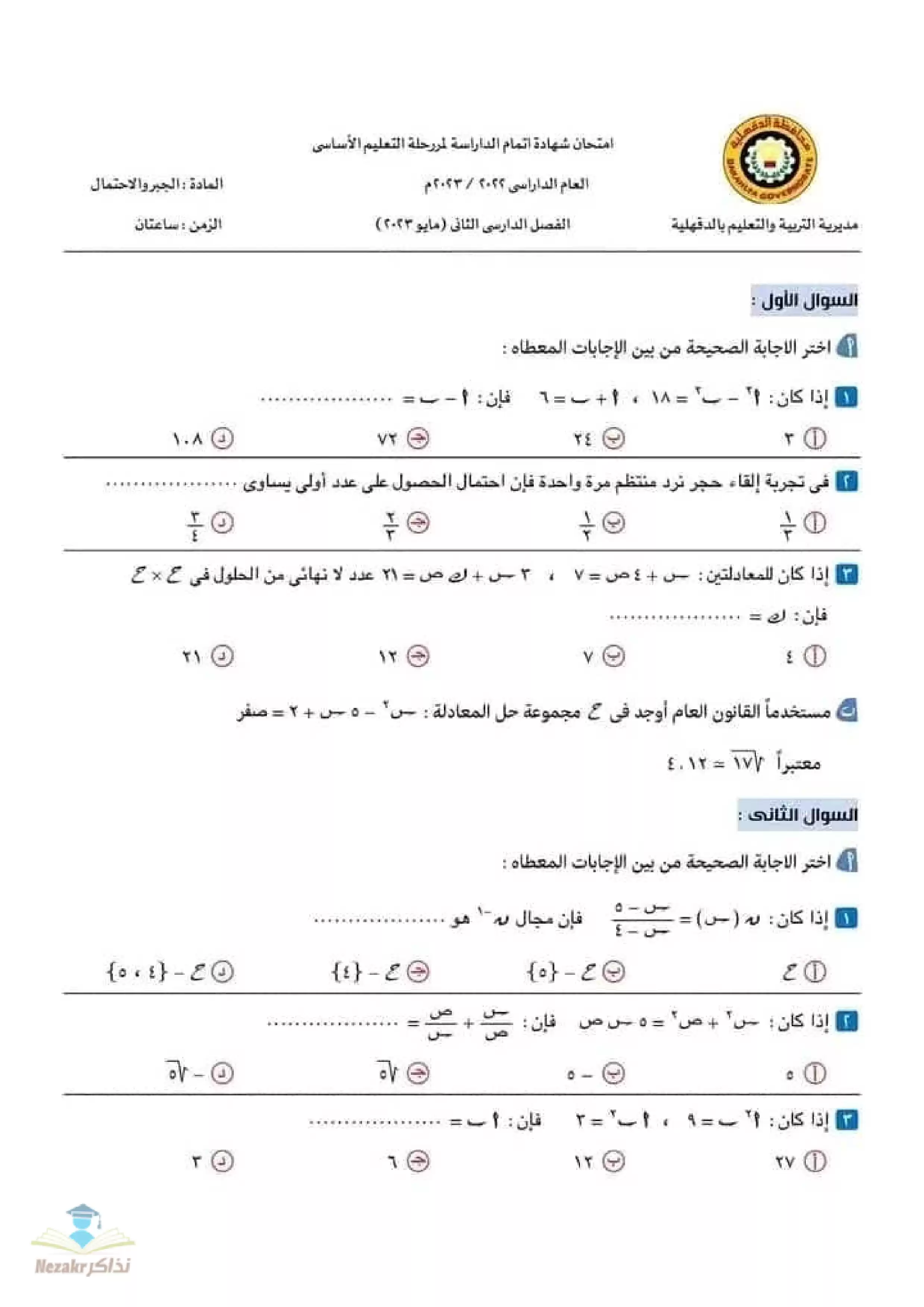 | بيانات الملف: (تجميع امتحانات المحافظات في الجبر والهندسة للشهادة الإعدادية 2023 - Nezakr) | |