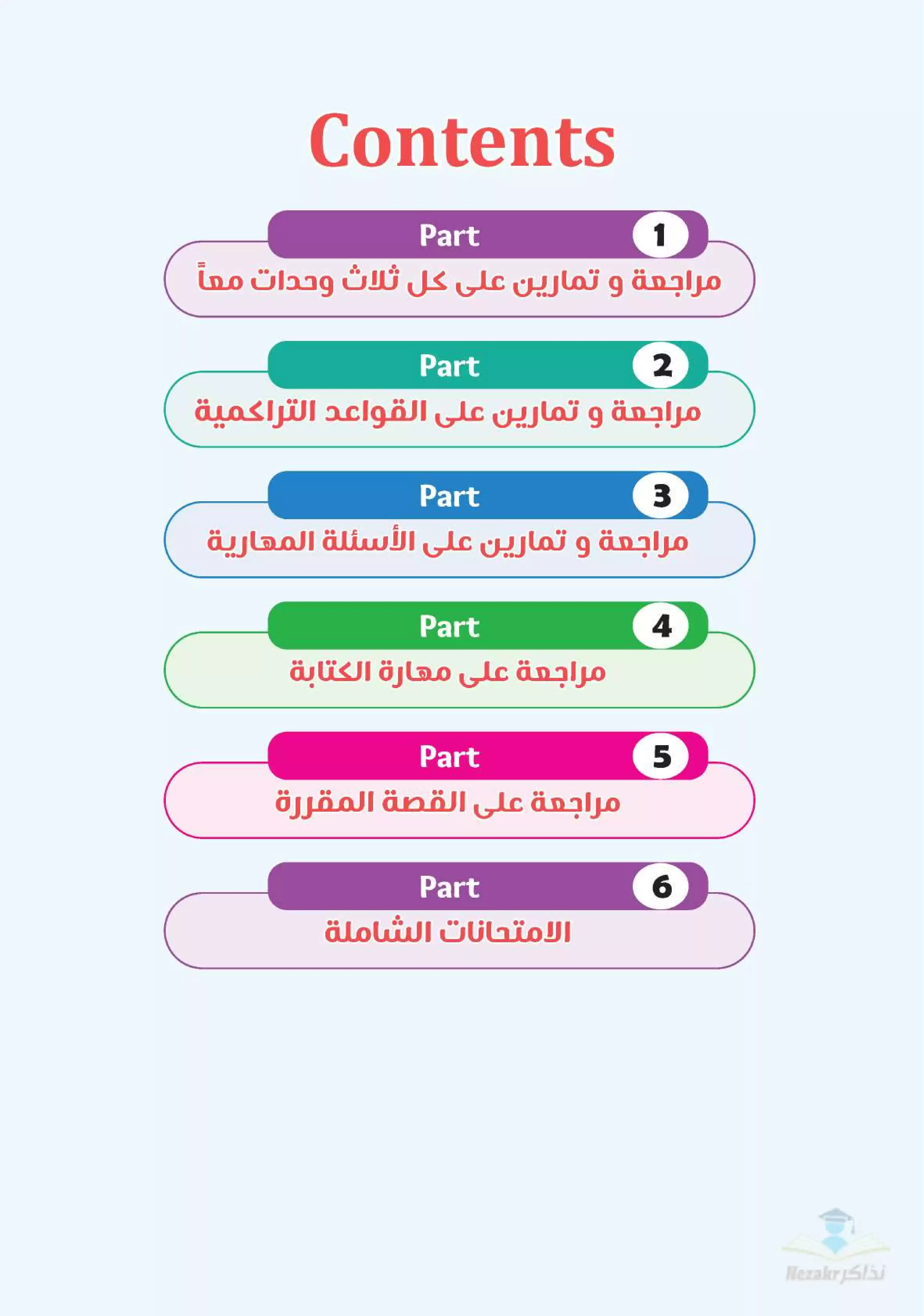 حيث يضم الملف مراجعة سريعة على أهم المفردات والقواعد في كل وحدة في منهج اللغة الإنجليزية كما يضم أسئلة متنوعة ومميزة على كل الوحدات على المفردات والقواعد، كما يحتوي الملف في نهايته على ملحق للإجابات النموذجية على كافة الأسئلة الواردة بالملف.