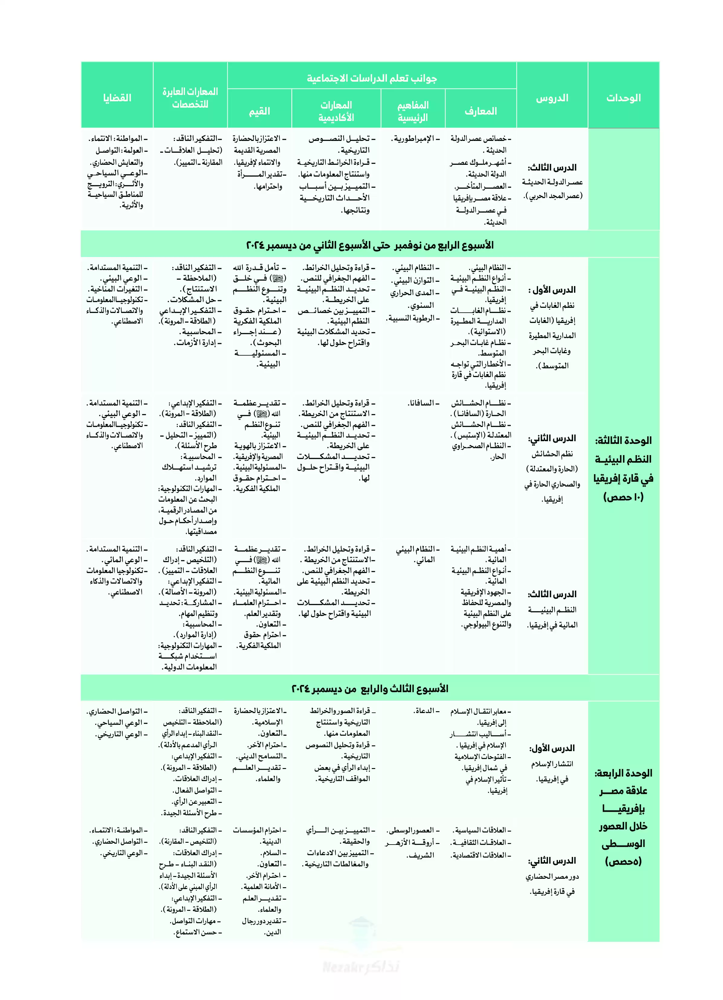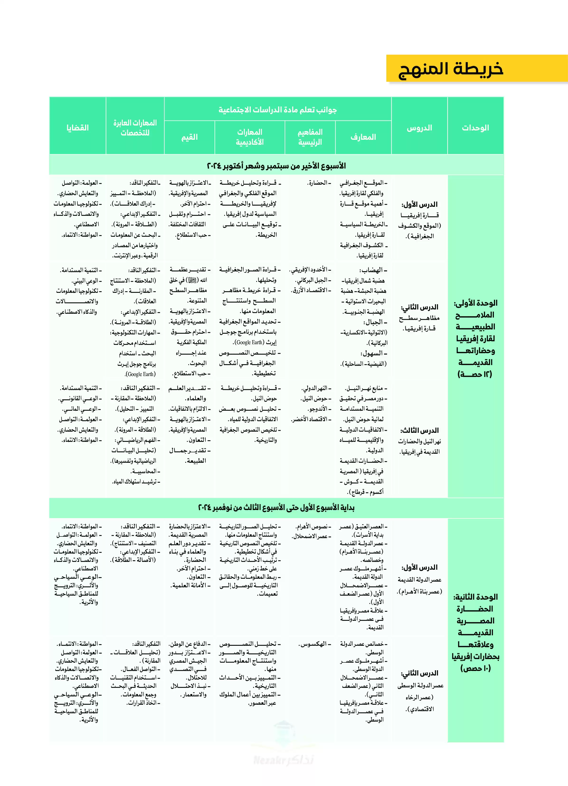 ويحتوي منهج الدراسات الجديد في الترم الأول لأولى إعدادي 4 وحدات أساسية، وهم كالآتي: