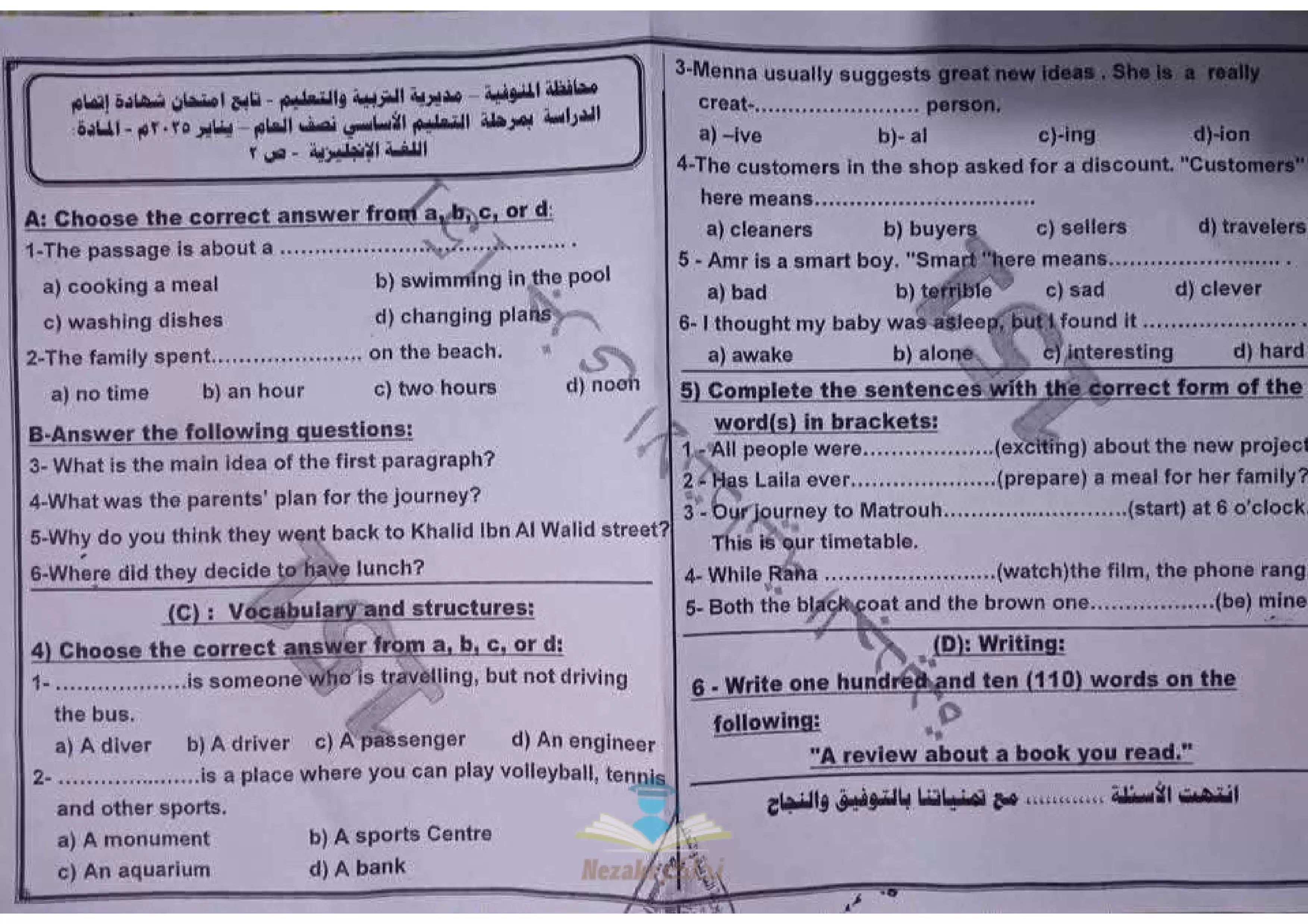 | بيانات الملف: (امتحان الانجليزي لثالثة إعدادي الترم الأول 2025 محافظة المنوفية - Nezakr) | |