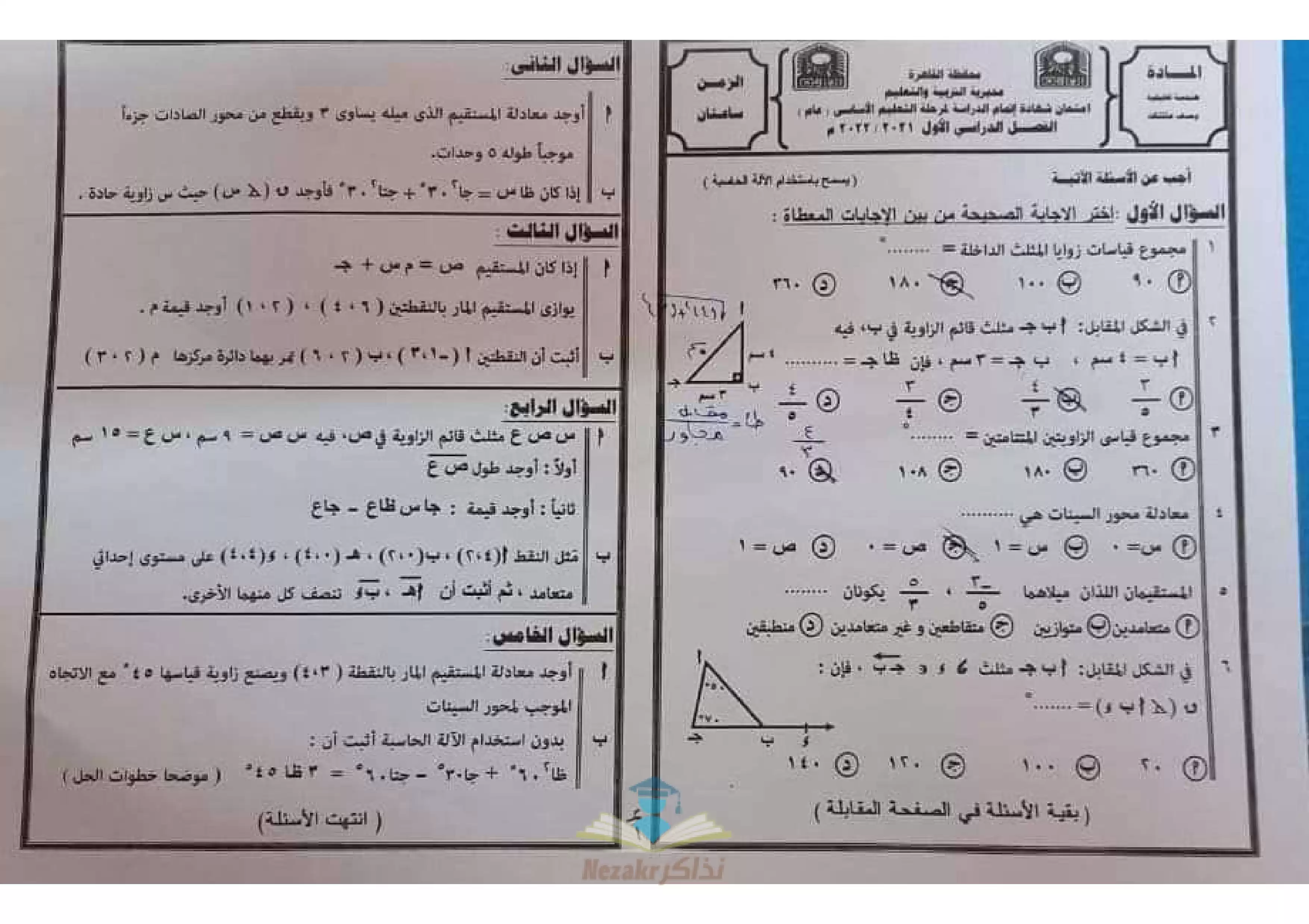 امتحانات الجبر والهندسة لثالثة إعدادي الترم الأول 2022 جميع المحافظات - Nezakr