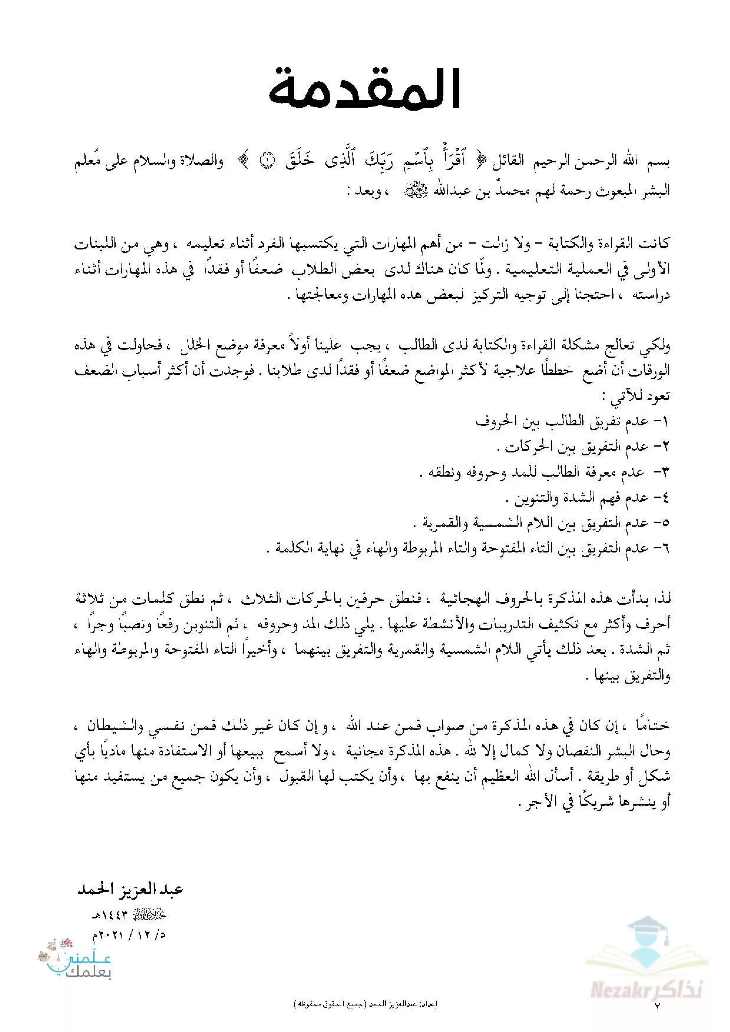 صفحة 2 من 121 صفحة من ملف: خطة علاجية لمهارات القراءة والكتابة للمرحلة الابتدائية - Nezakr