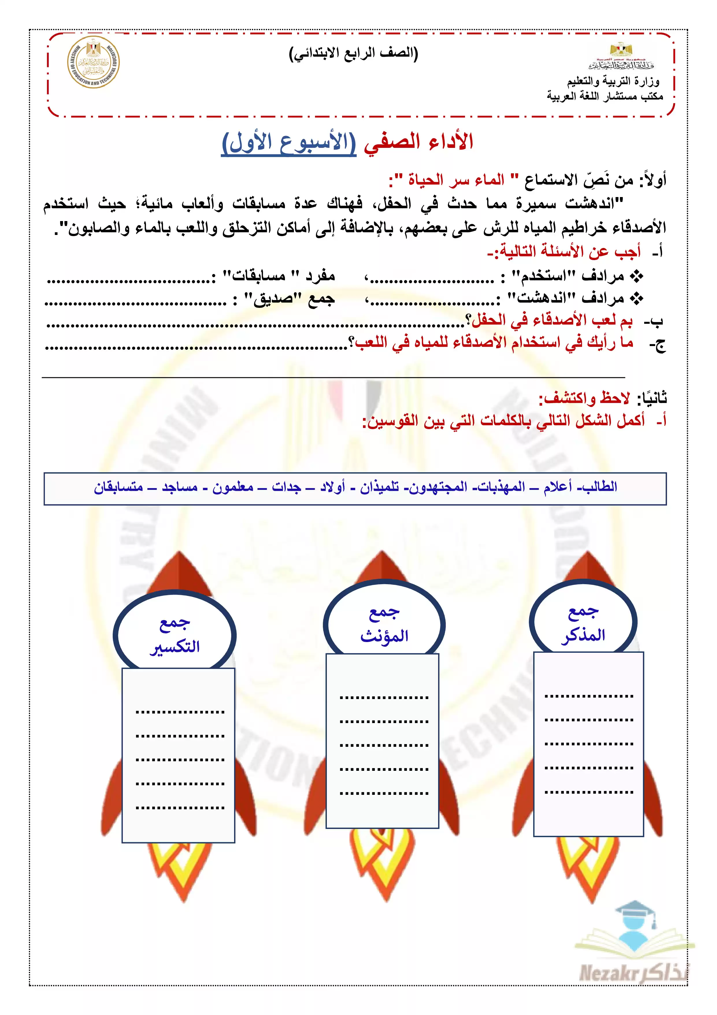 يحتوي الملف المرفق على تجميع ملفات الآداء الصفي والواجب المنزلي والتقييم الخاص بالأسبوع الأول في مادة اللغة العربية للصف الرابع الابتدائي الترم الثاني 2025، وهو بصيغة PDF وبجودة عالية متاح للتحميل والتصفح مجاناً من موقع نذاكر.
