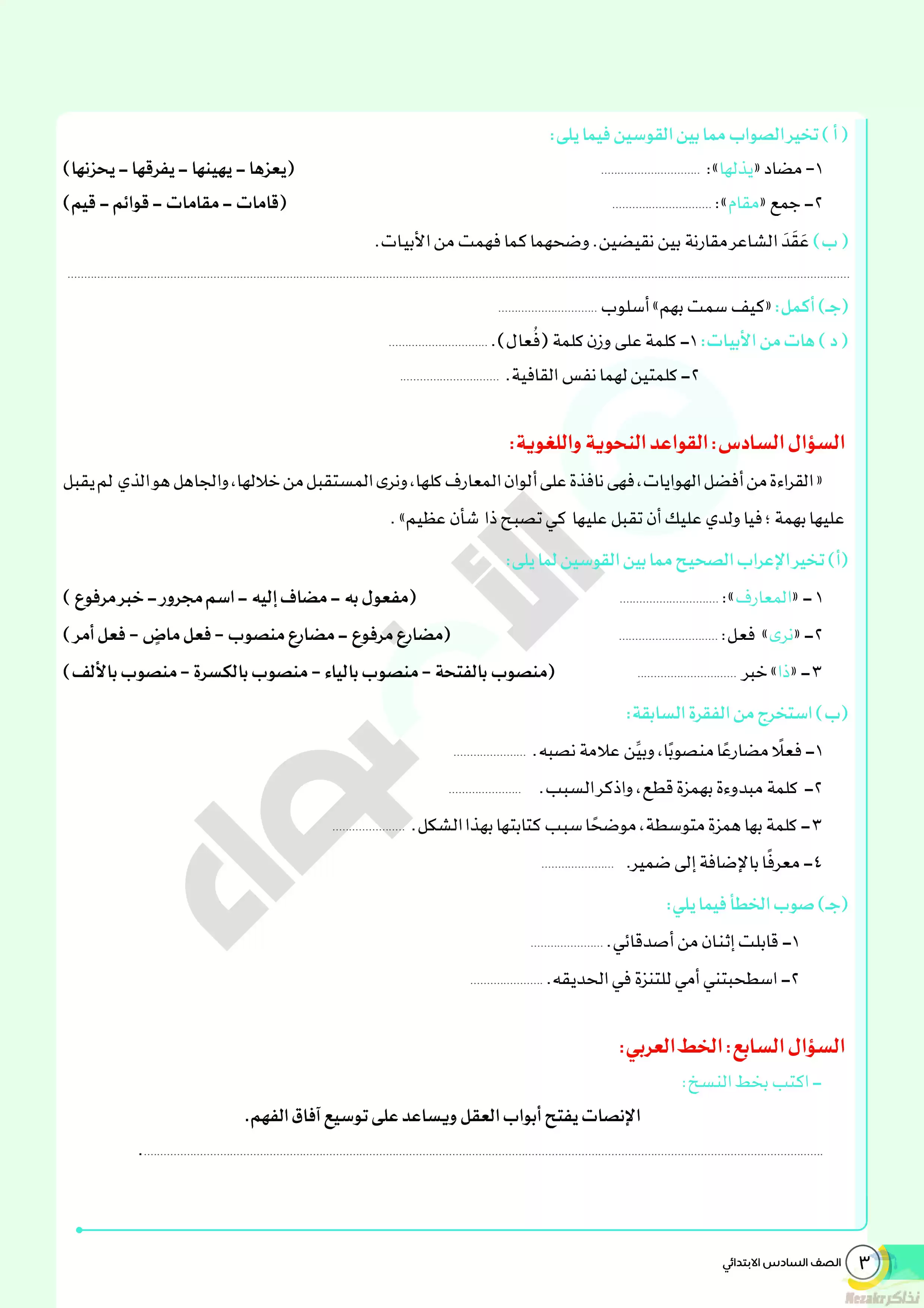 • نماذج الأضواء الاسترشادية في اللغة العربية للصف السادس الابتدائي