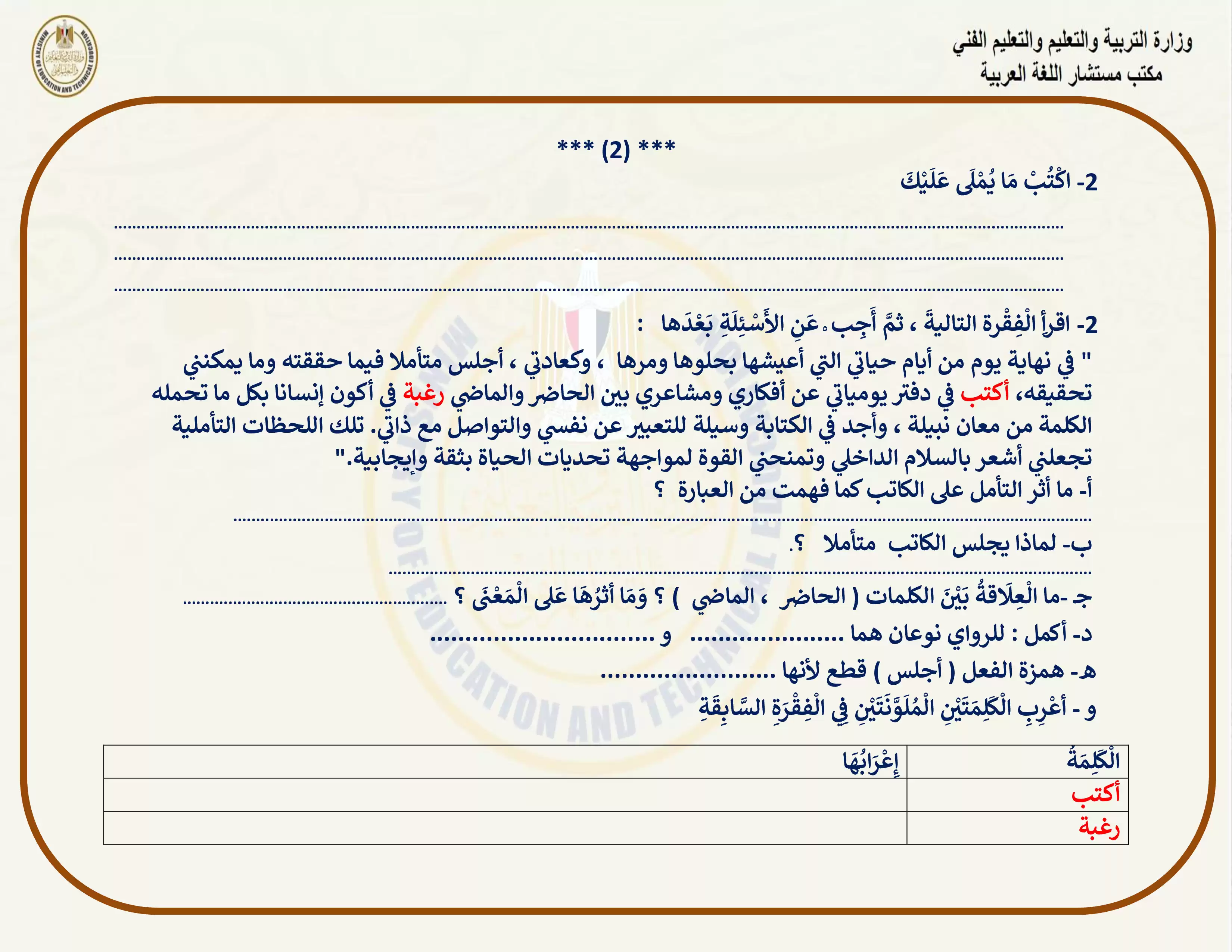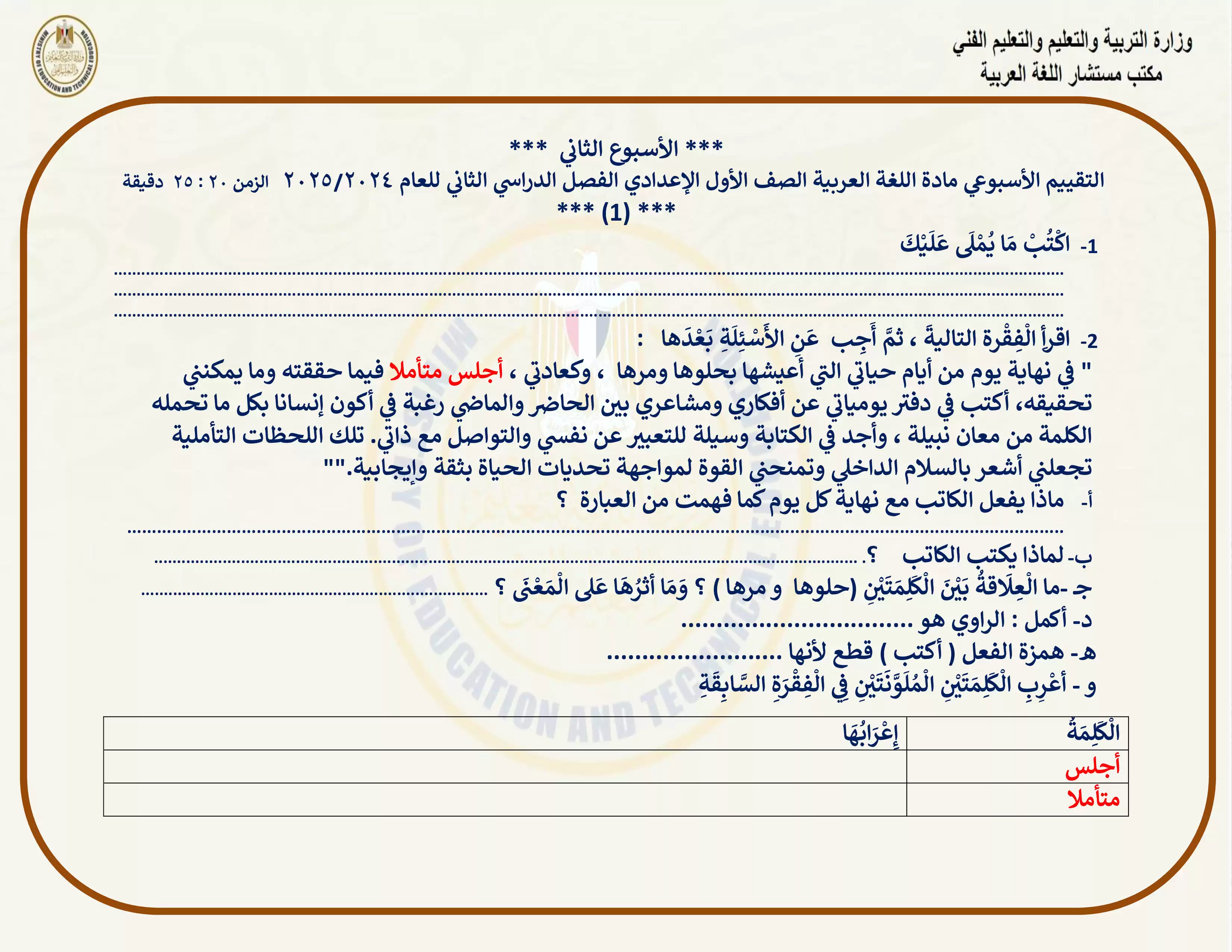 | بيانات الملف: (التقييمات الخاصة بالأسبوع الثاني في اللغة العربية للصف الاول الاعدادي الترم الثاني 2025 - Nezakr) | |