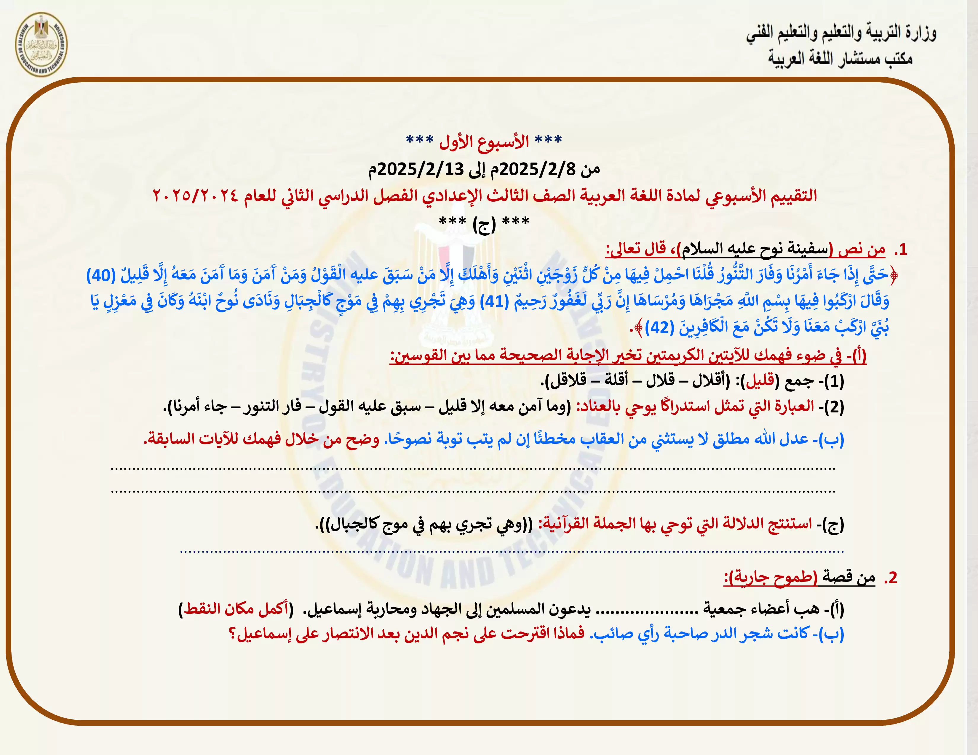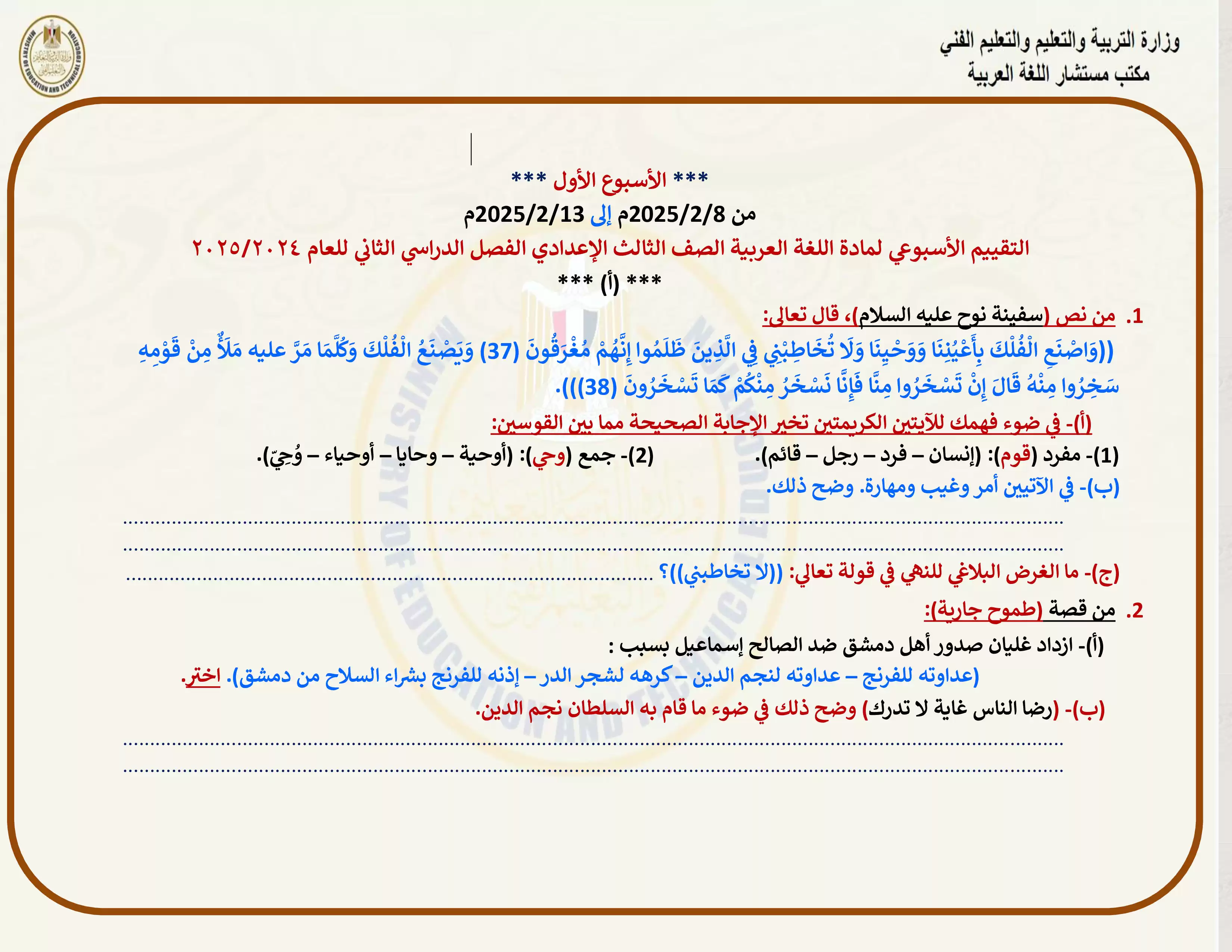 • التقييم الأسبوعي الأول في مادة اللغة العربية للصف الثالث الإعدادي الترم الثاني 2025