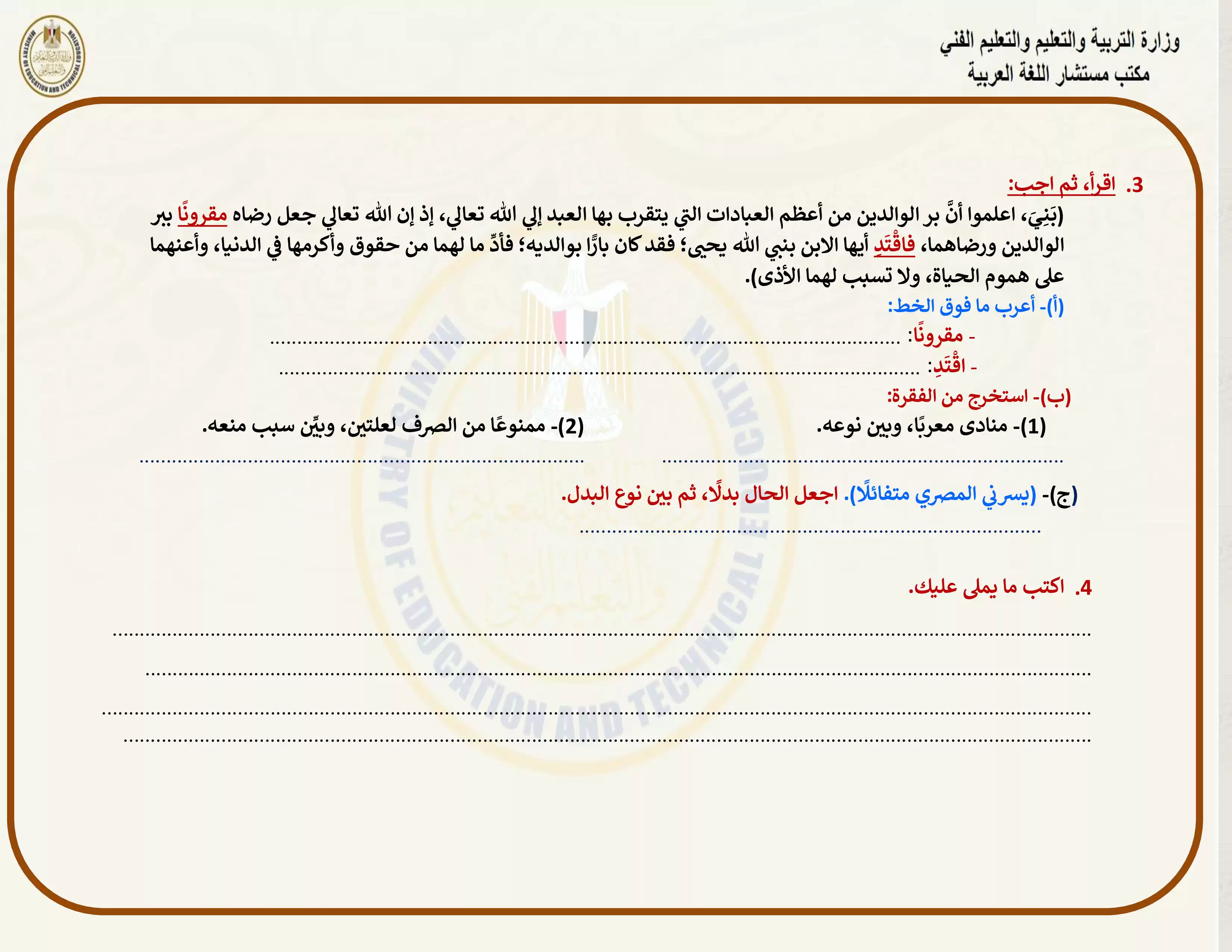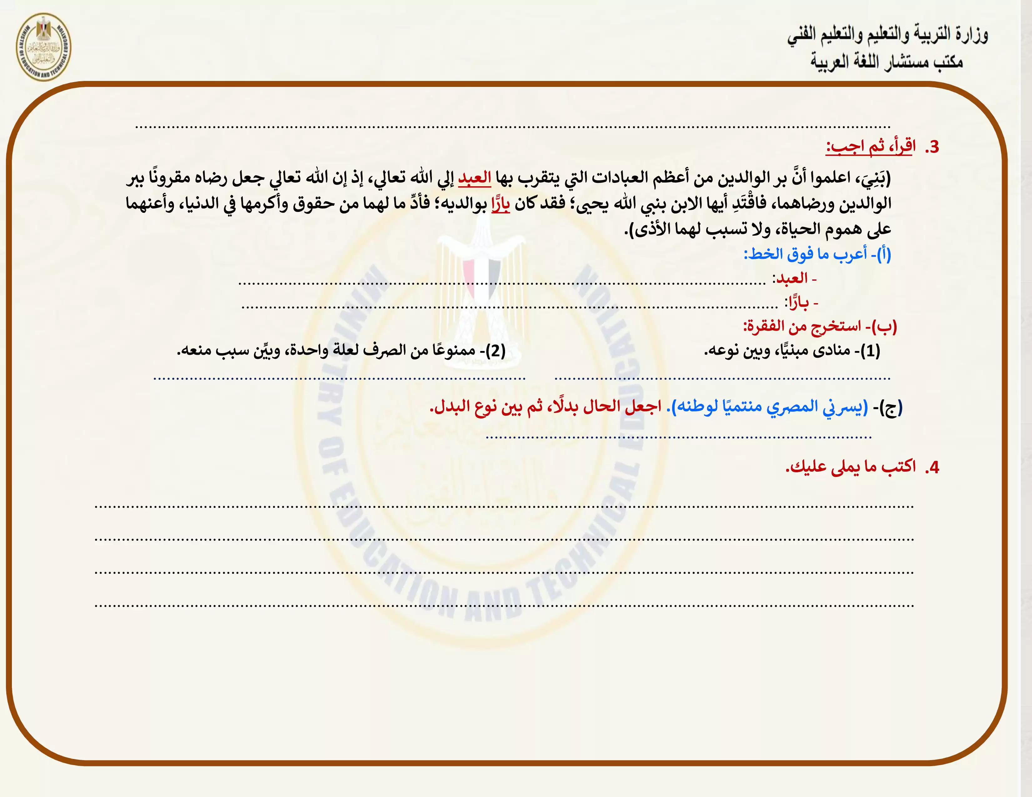 صفحة 4 من 8 صفحة من ملف: التقييمات الخاصة بالأسبوع الأول في اللغة العربية للصف الثالث الاعدادي الترم الثاني 2025 - Nezakr