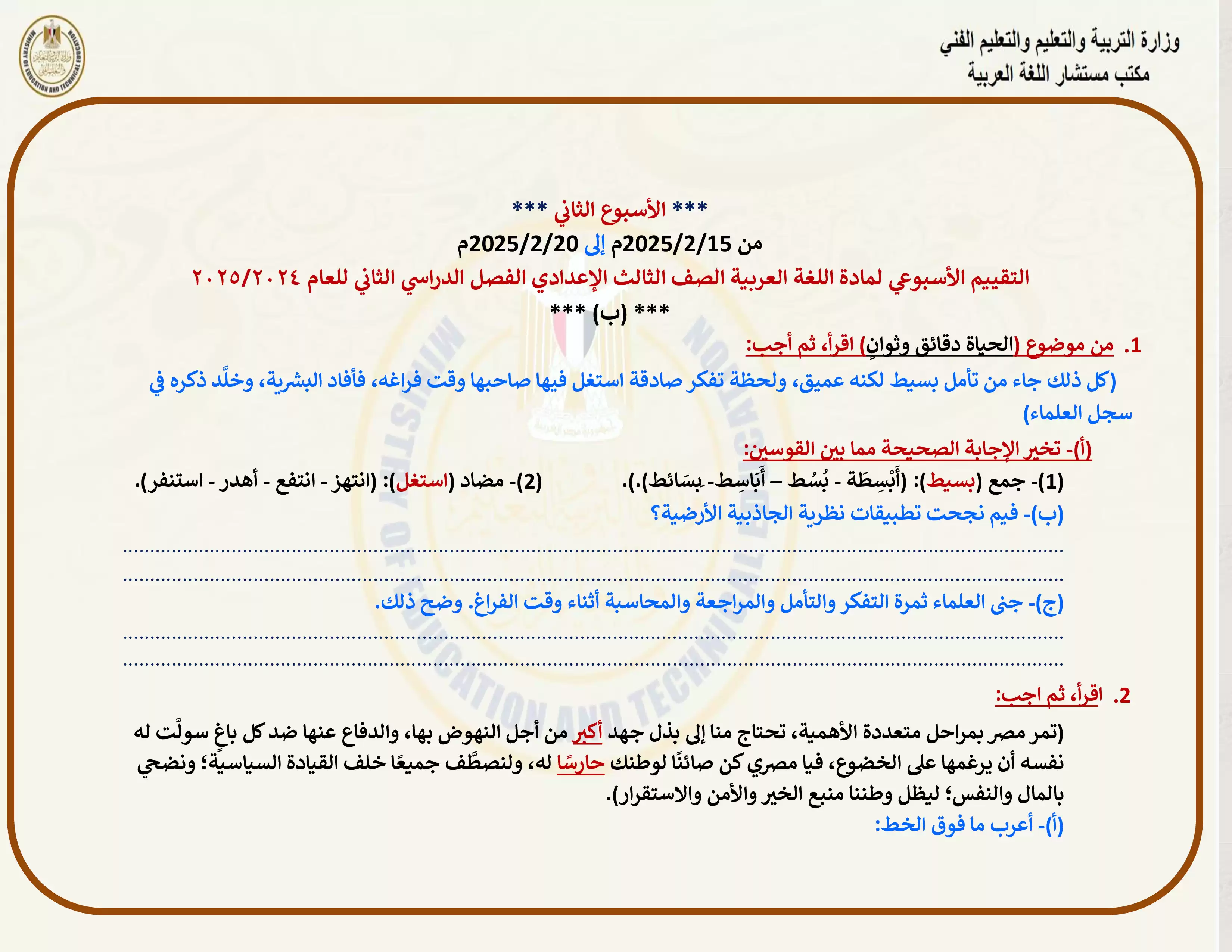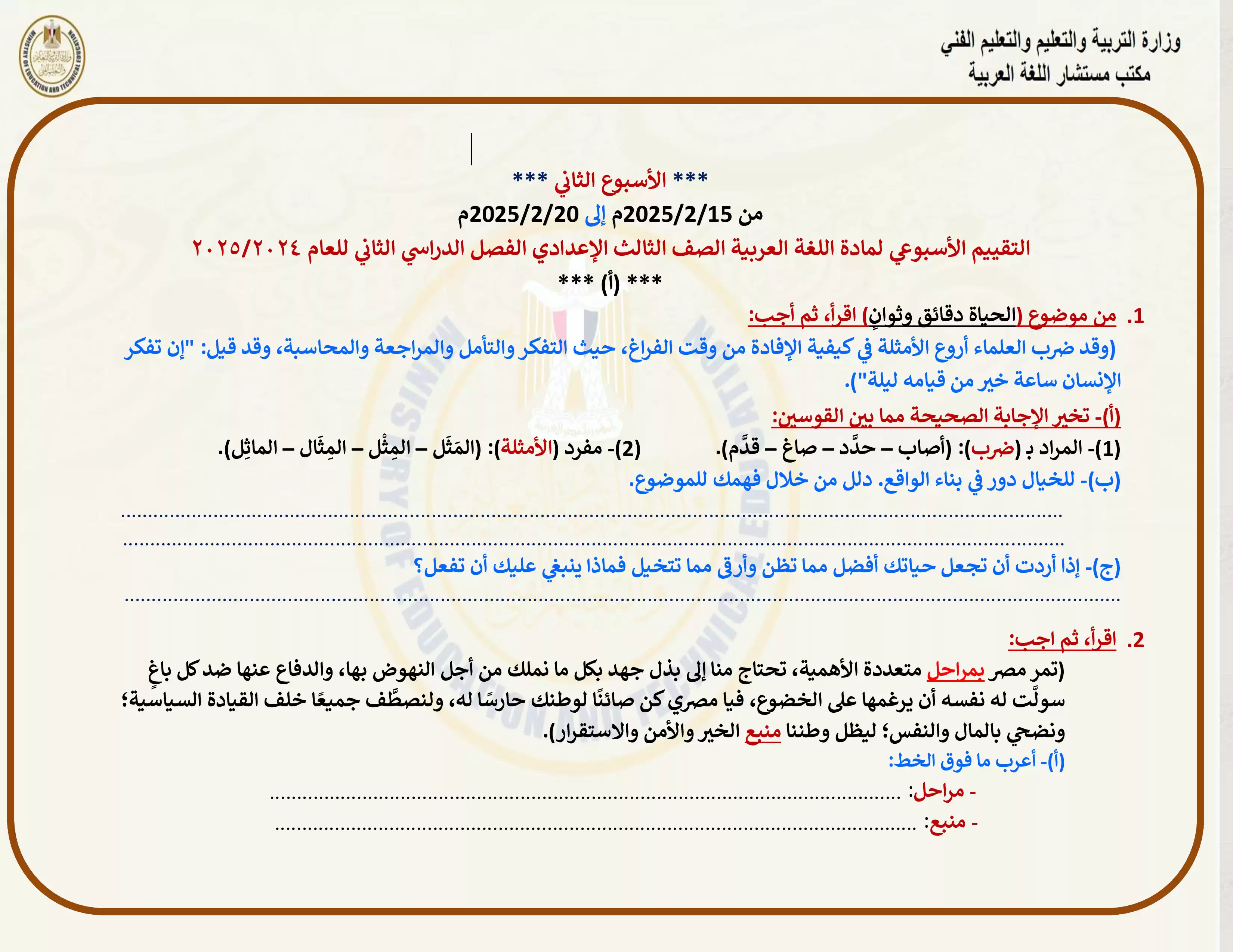 • التقييم الأسبوعي الثاني في مادة اللغة العربية للصف الثالث الإعدادي الترم الثاني 2025