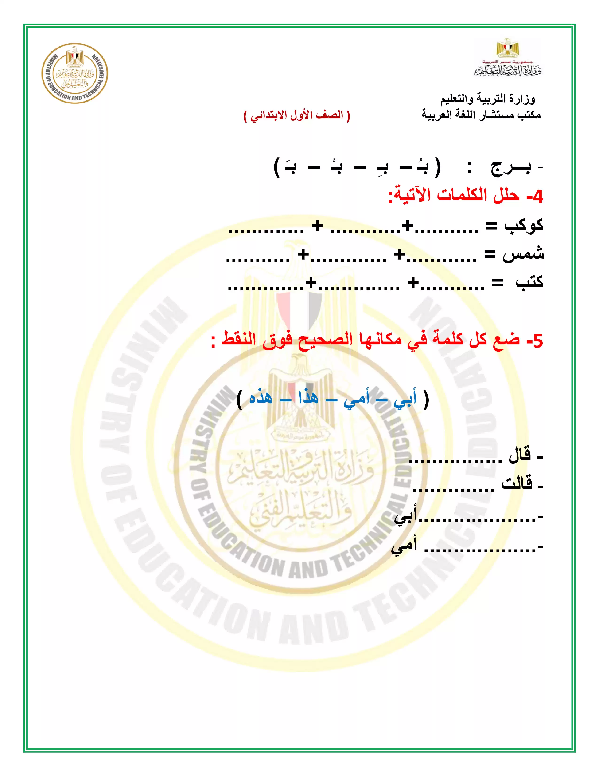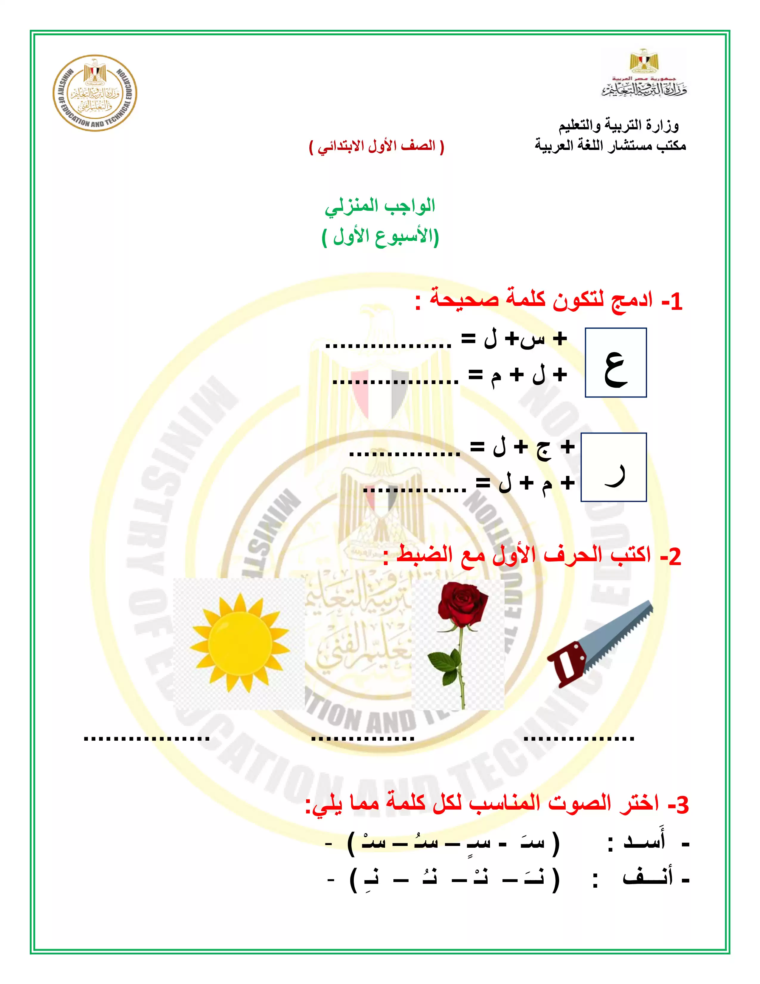 • الآداء المنزلي للصف الأول الابتدائي في اللغة العربية
