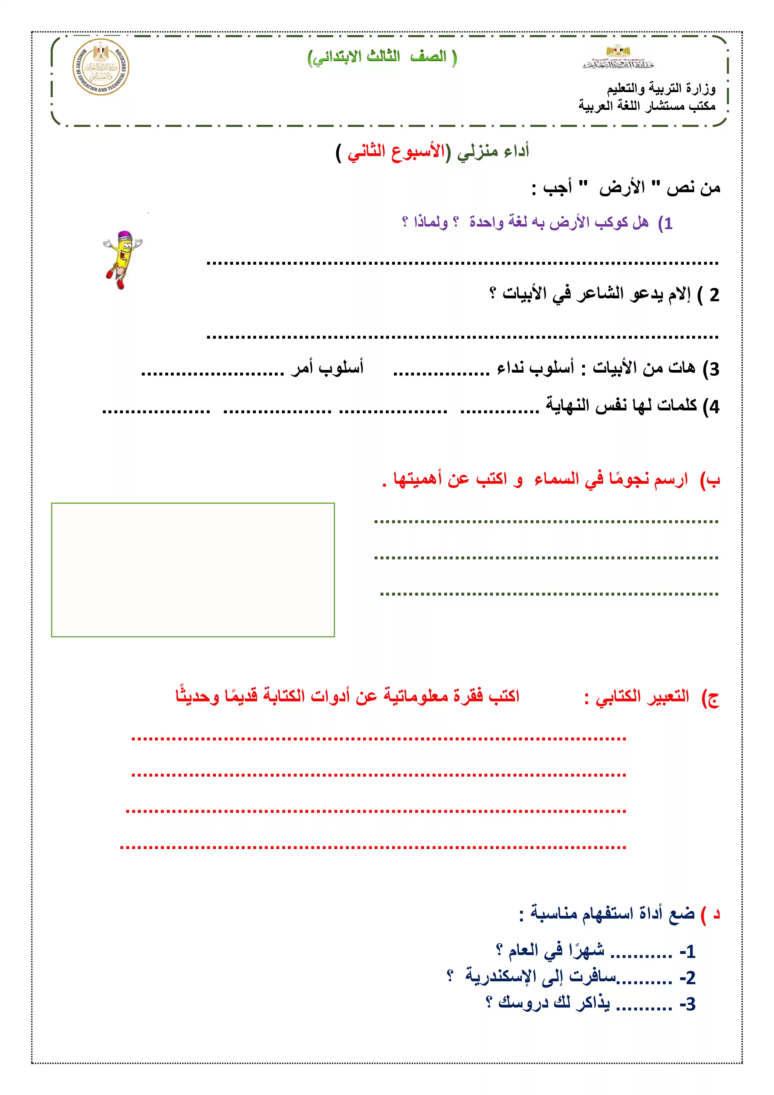 • الآداء المنزلي للصف الثالث الابتدائي في اللغة العربية