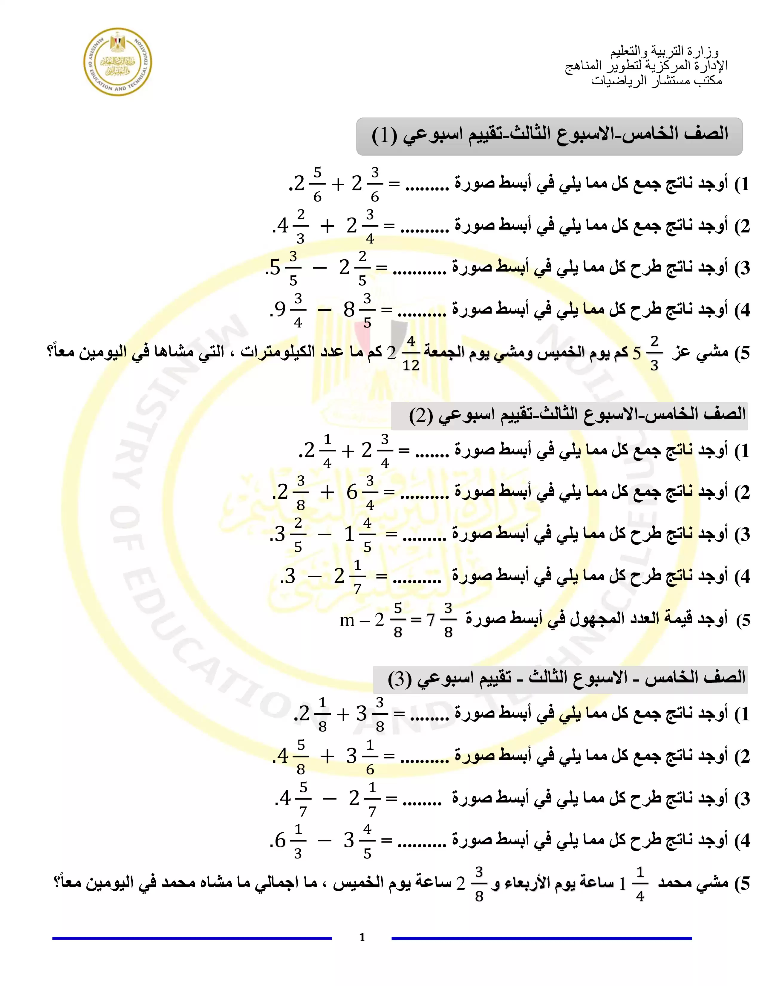 | بيانات الملف: (التقييمات الخاصة بالأسبوع الثالث في الرياضيات للصف الخامس الابتدائي الترم الثاني 2025 - Nezakr) | |