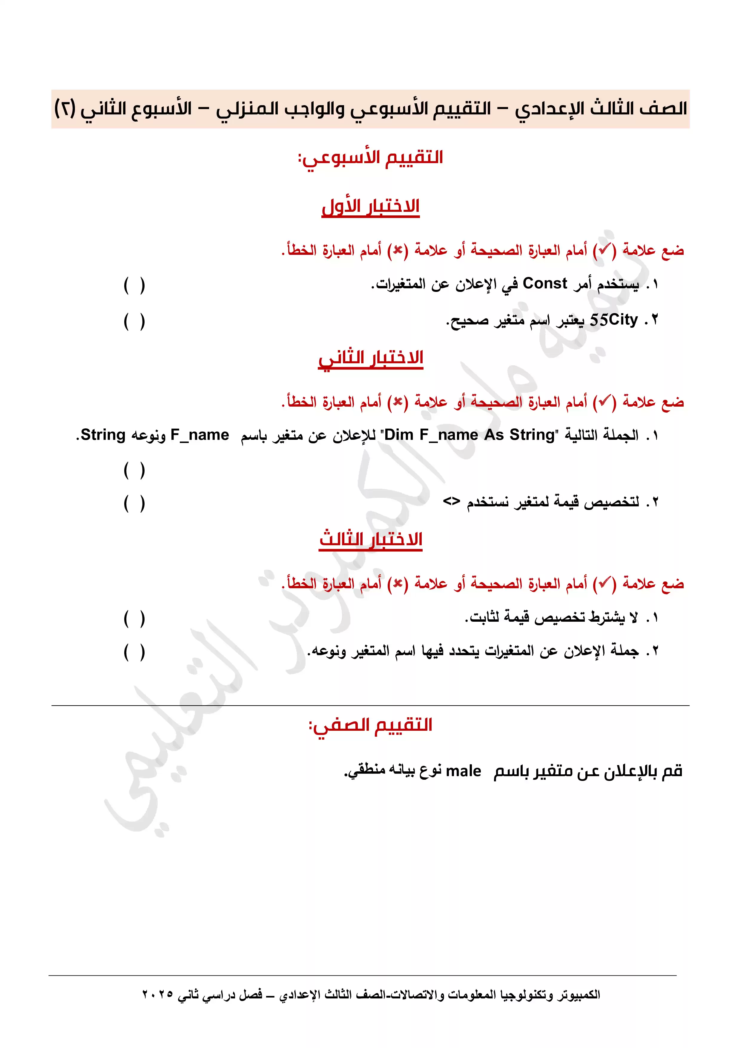 | بيانات الملف: (التقييمات الخاصة بالأسبوع الثاني في تكنولوجيا المعلومات والاتصالات للصف الثالث الاعدادي الترم الثاني 2025 - Nezakr) | |