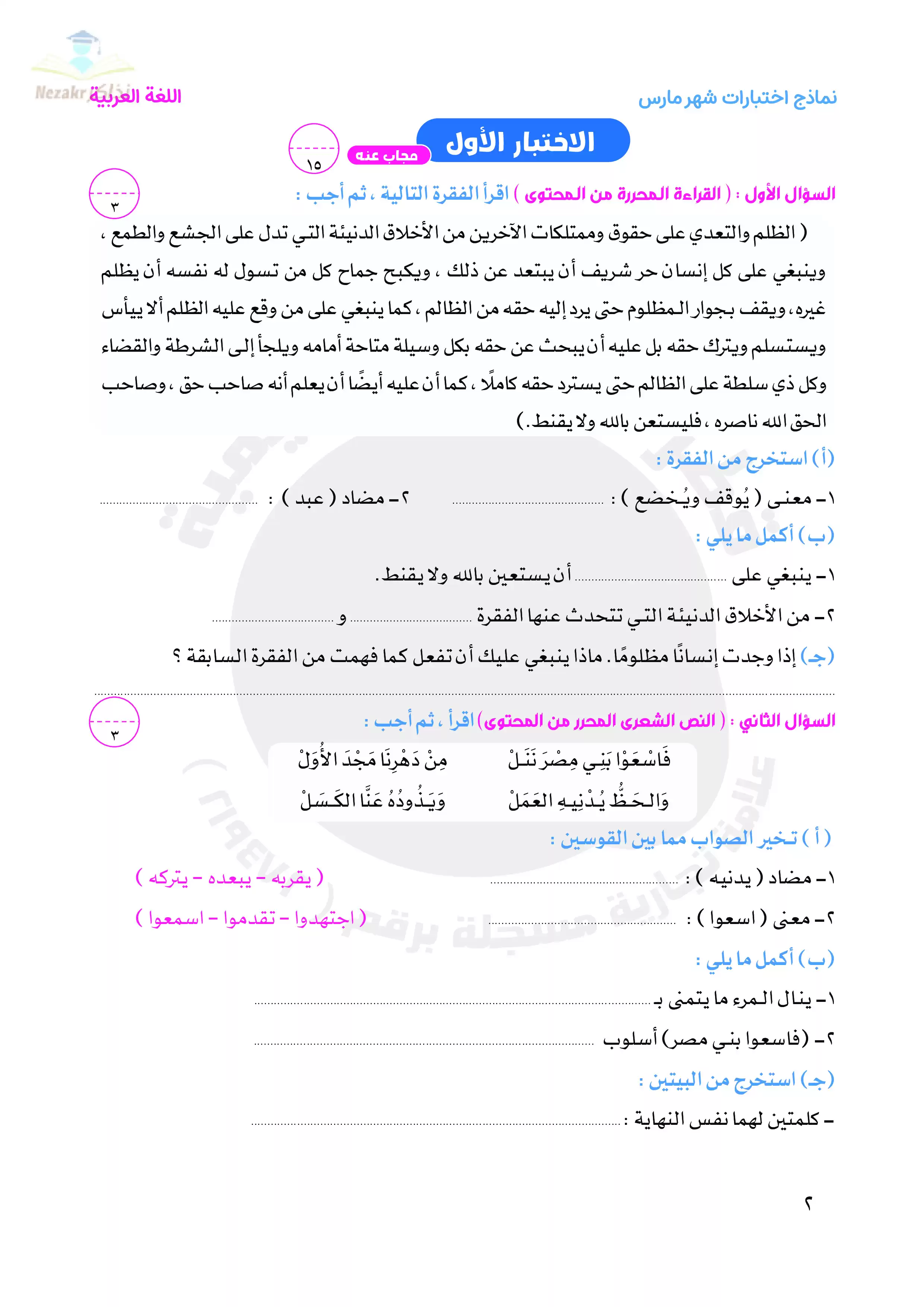 صفحة 2 من 52 صفحة من ملف: نماذج اختبارات شهر مارس للصف الخامس الابتدائى من قطر الندى واجابتها النموذجية