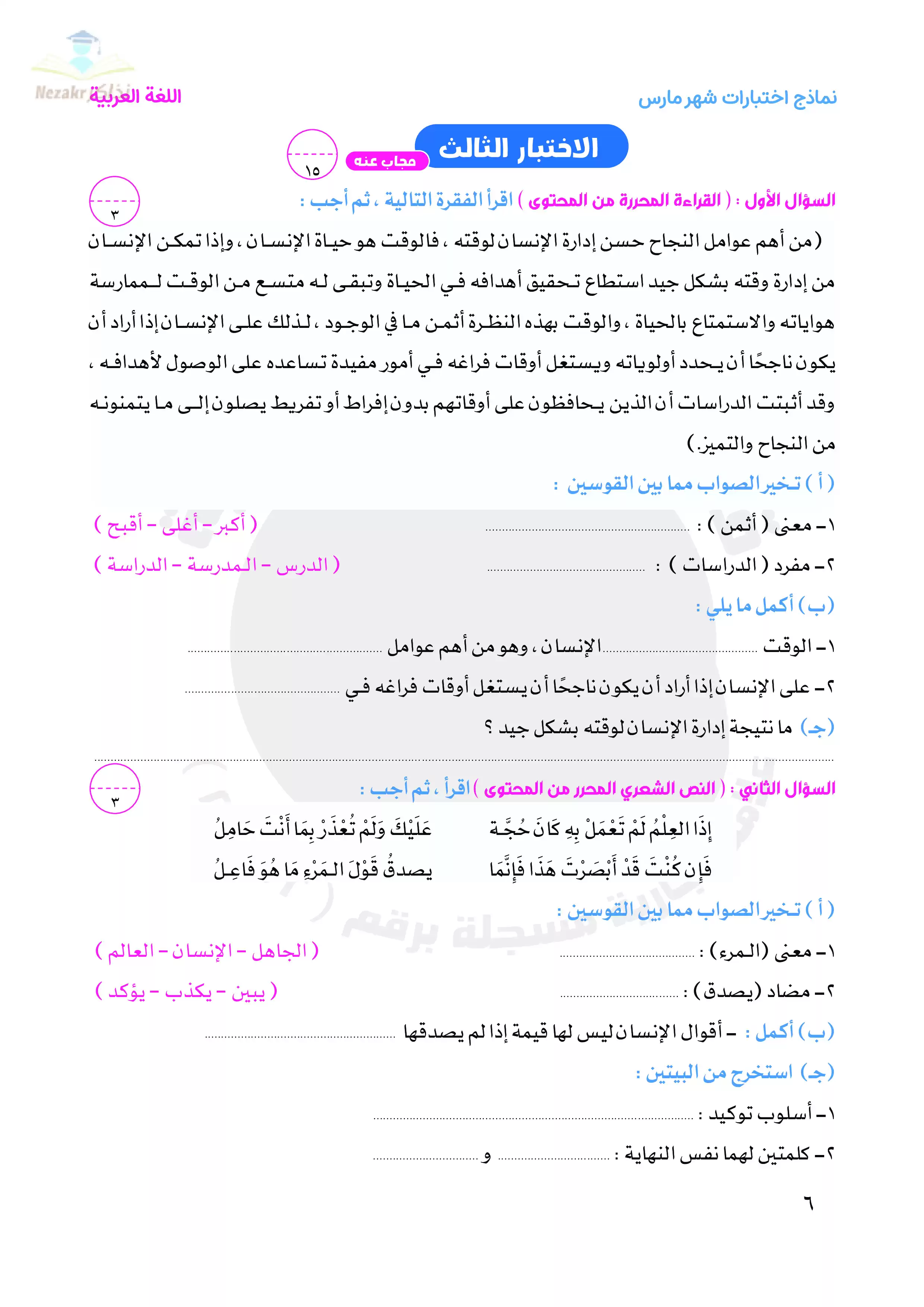صفحة 6 من 52 صفحة من ملف: نماذج اختبارات شهر مارس للصف الخامس الابتدائى من قطر الندى واجابتها النموذجية