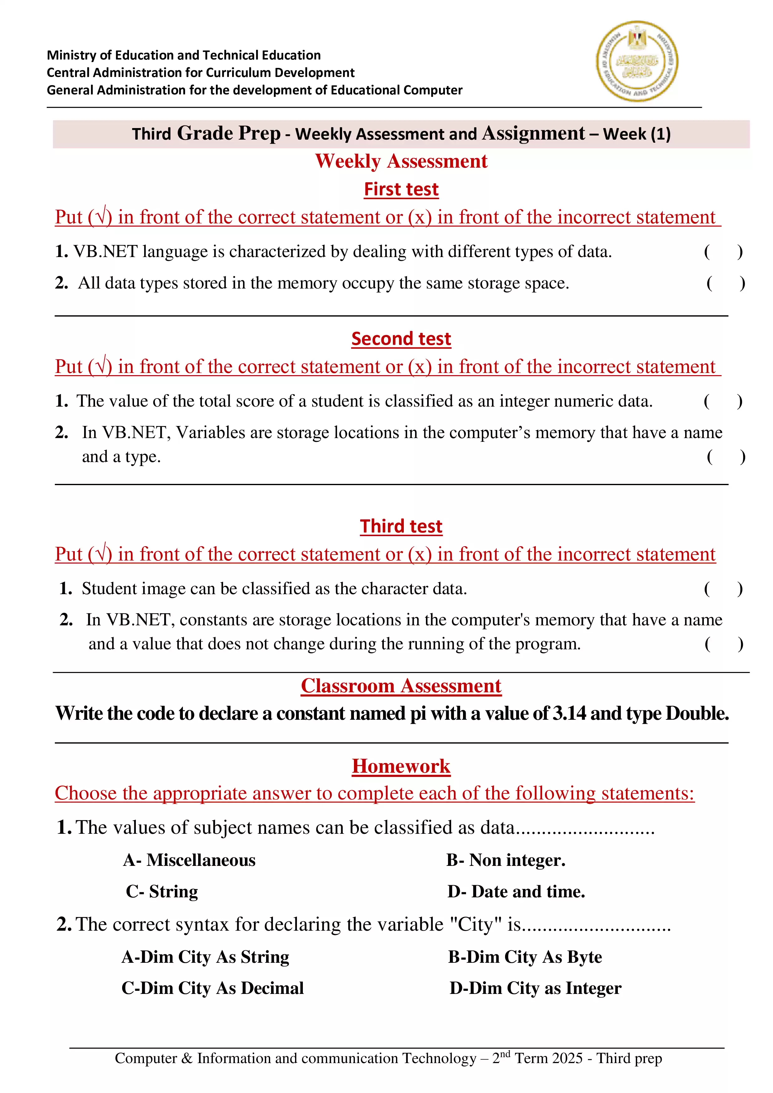 | بيانات الملف: (التقييمات الخاصة بالأسبوع الاول في تكنولوجيا المعلومات والاتصالات لغات ICT للصف الثالث الاعدادي الترم الثاني 2025 - Nezakr) | |