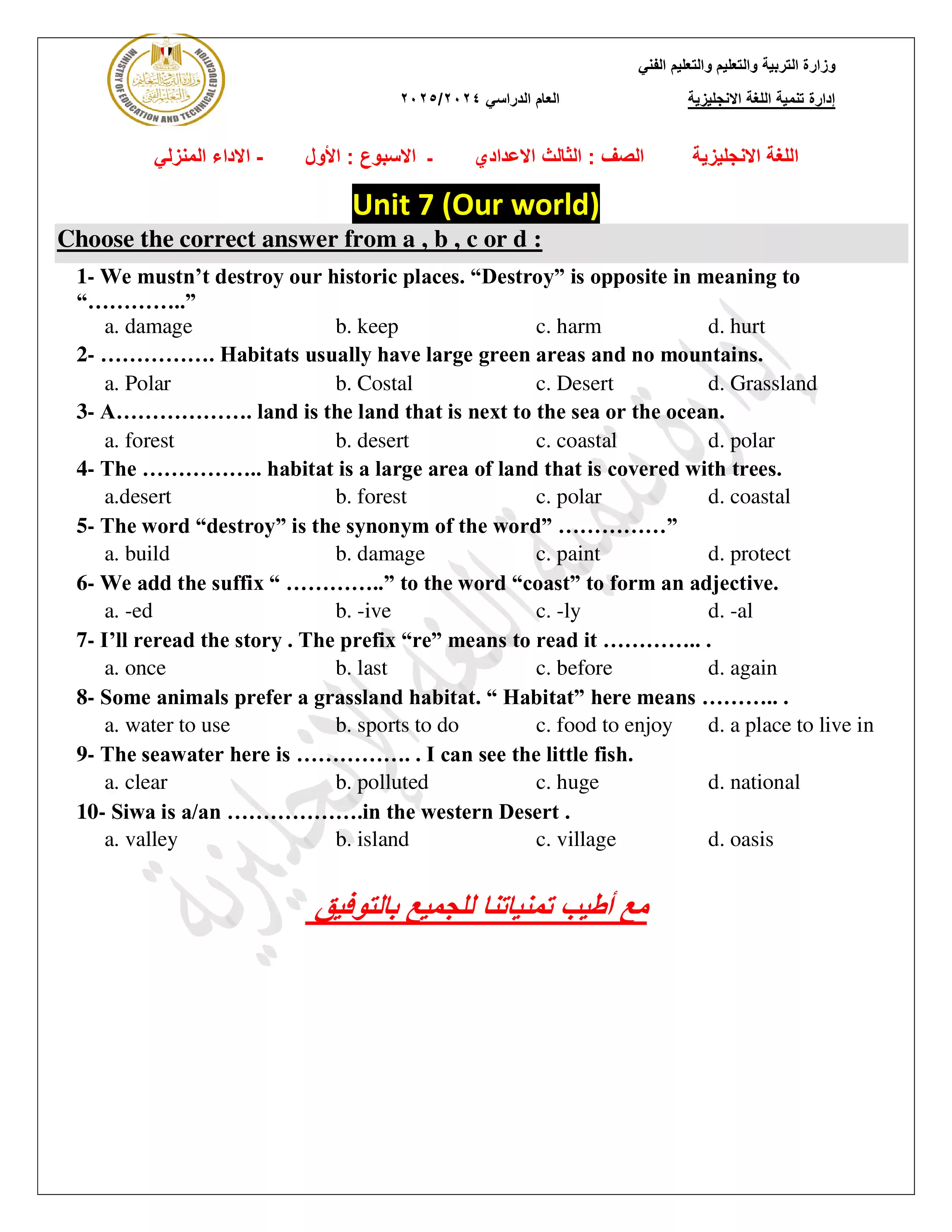 صفحة 2 من 2 صفحة من ملف: الواجب والآداء المنزلي للأسبوع الاول في اللغة الإنجليزية للصف الثالث الاعدادي الترم الثاني 2025 - Nezakr