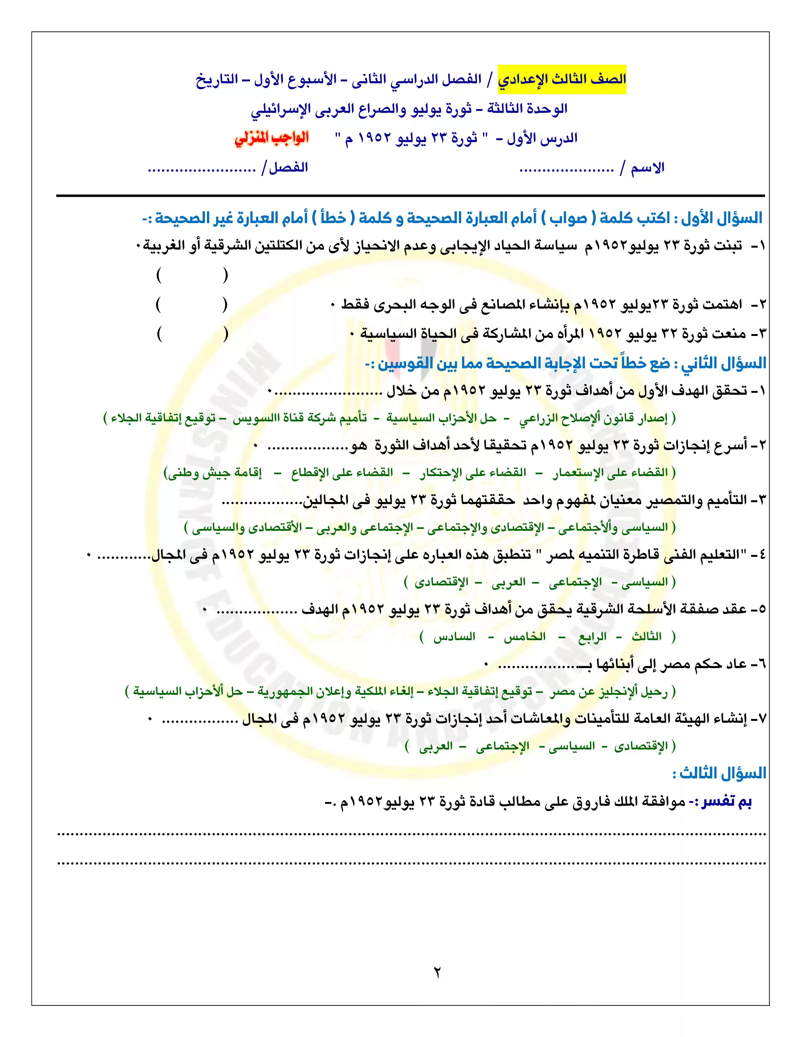 • الواجب المنزلي في الدراسات الاجتماعية لثالثة إعدادي