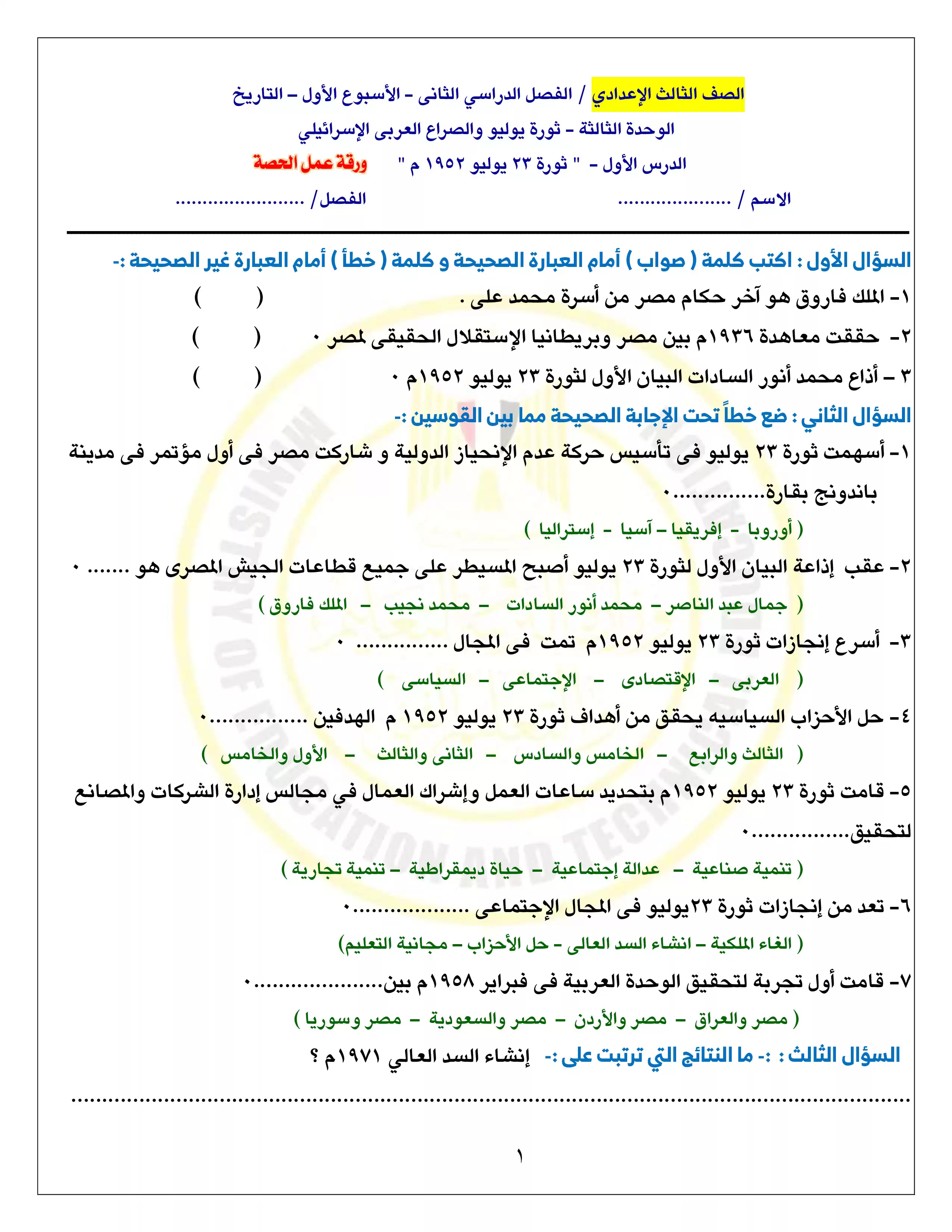 1. تقييمات الأسبوع الاول في مادة الدراسات الاجتماعية للصف الثالث الاعدادي الترم الثاني 2025 بصيغة PDF