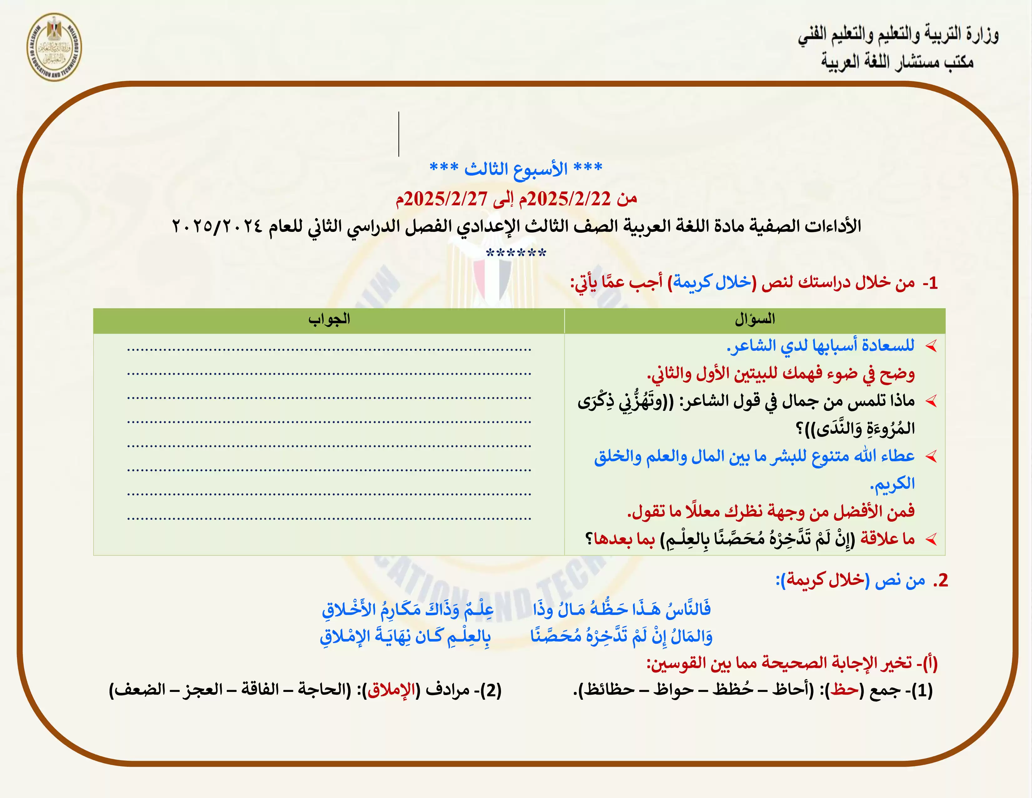 | بيانات الملف: (الآداءات الصفية للأسبوع الثالث في اللغة العربية للصف الثالث الإعدادي الترم الثاني 2025 - Nezakr) | |