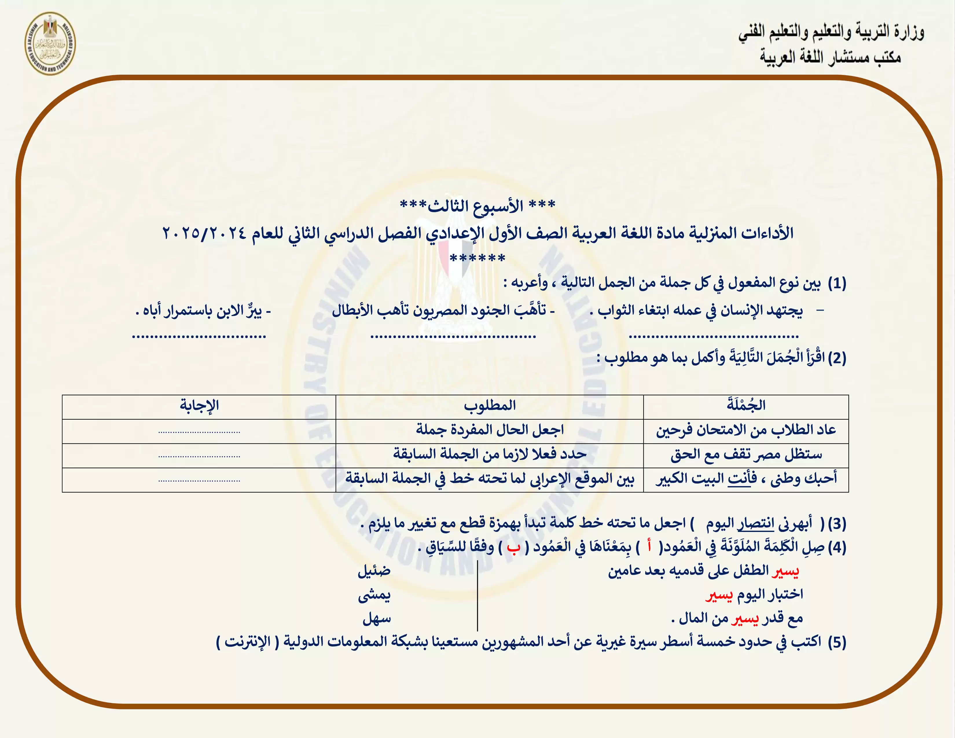 | بيانات الملف: (الواجب والآداء المنزلي للأسبوع الثالث في اللغة العربية للصف الأول الاعدادي الترم الثاني 2025 - Nezakr) | |