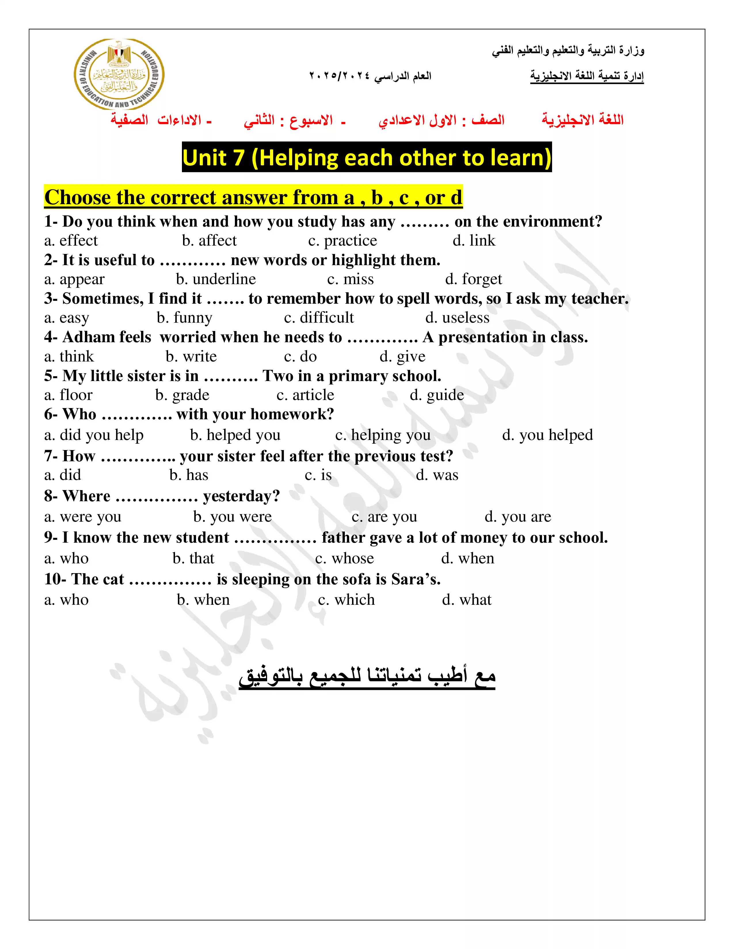الآداء الصفي للصف الاول الإعدادي في الترم الثاني 2025