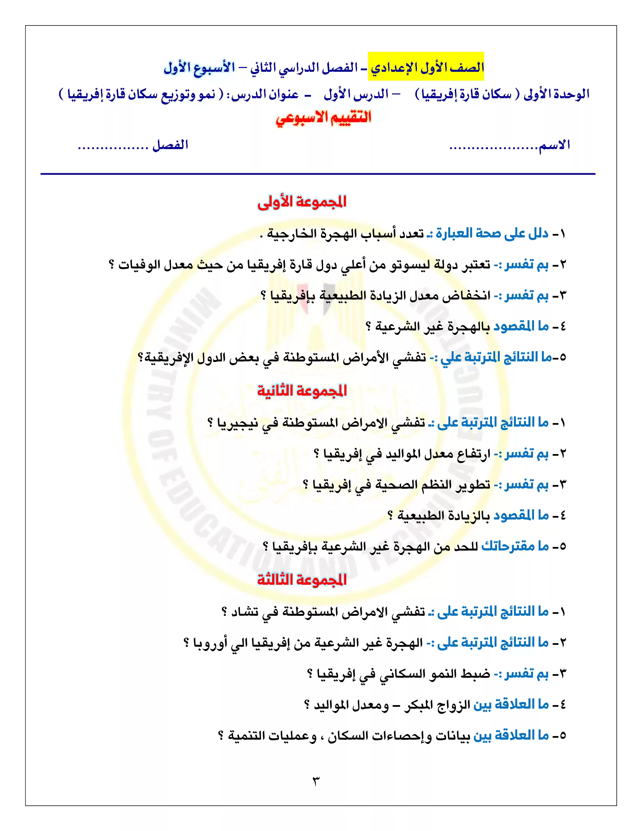 صفحة 3 من 4 صفحة من ملف: الآداءات الصفية للأسبوع الأول في الدراسات الاجتماعية للصف الاول الإعدادي الترم الثاني 2025