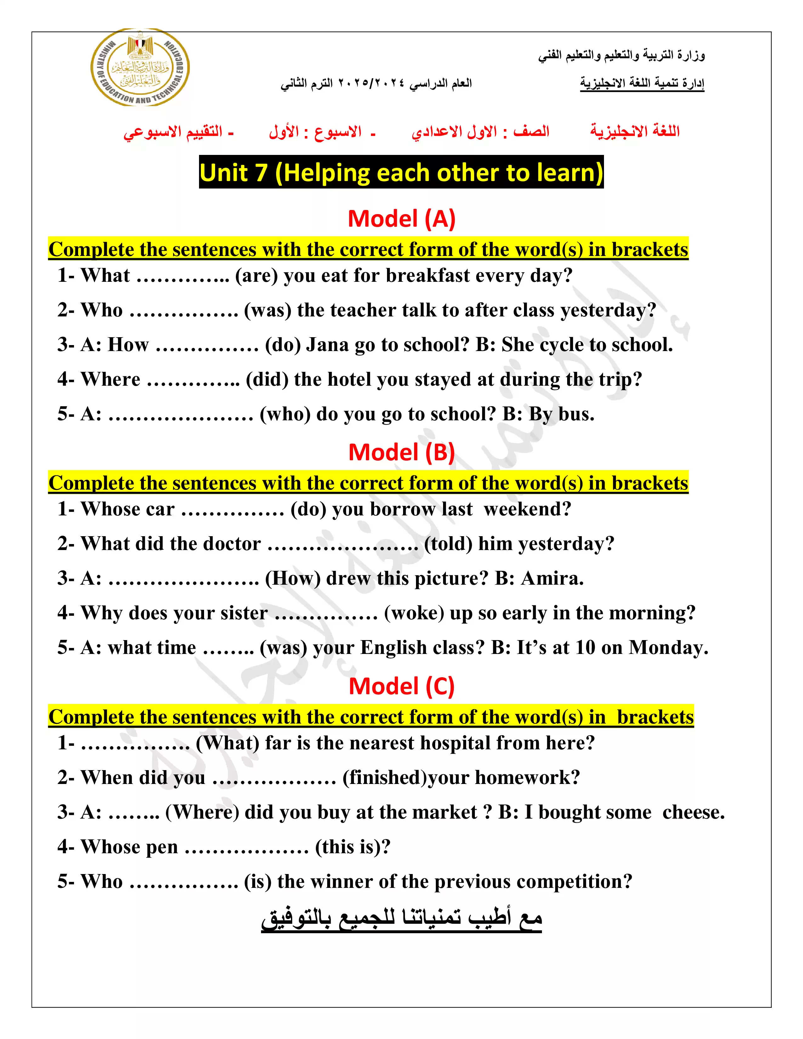 • تقييمات مادة الانجليزي للصف الاول الإعدادي