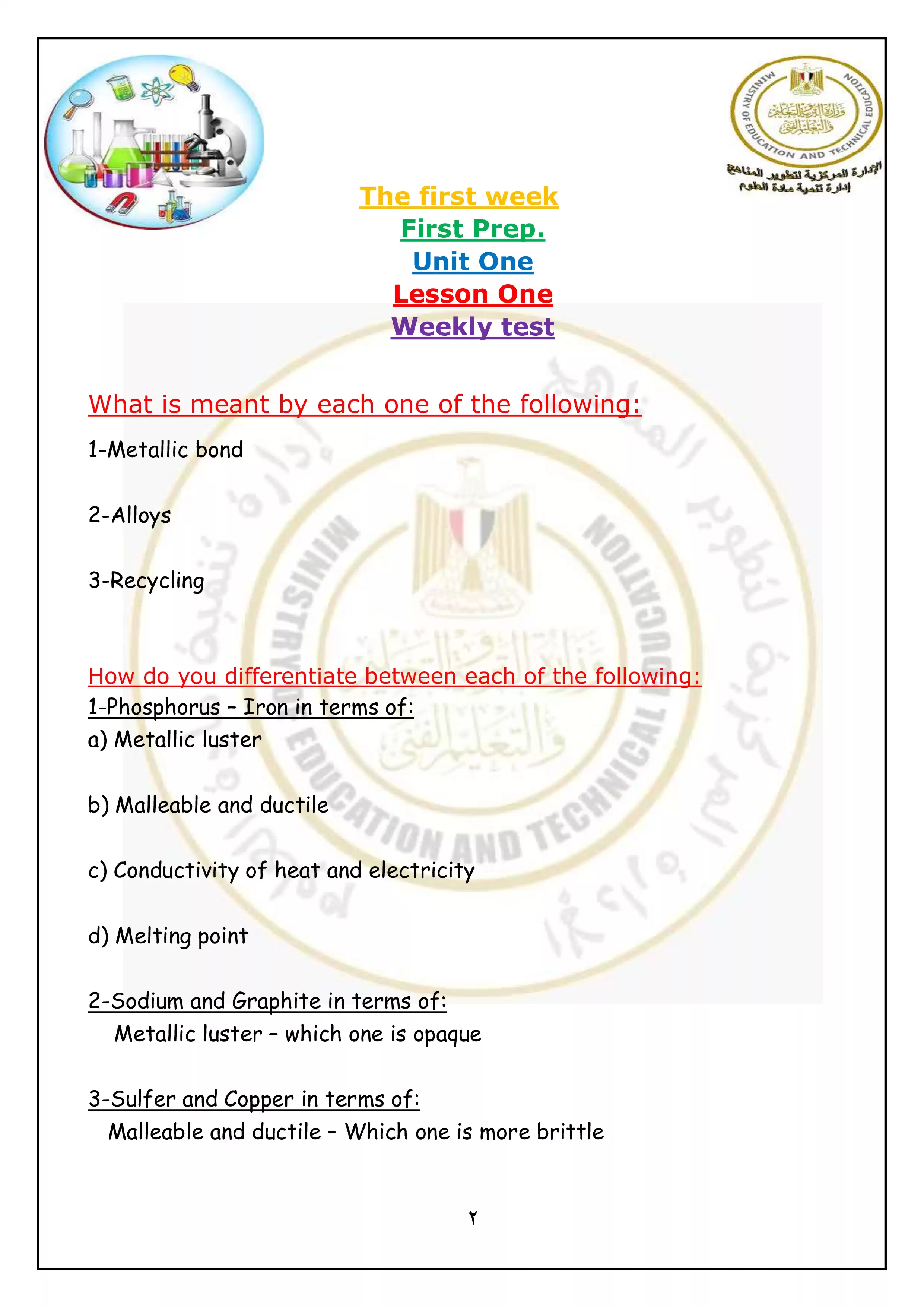 يحتوي الملف المرفق على التقييمات الخاصة بالأسبوع الأول في مادة العلوم للغات (الساينس) للصف الأول الإعدادي الترم الثاني 2025، وهو بصيغة PDF وبجودة عالية متاح للتحميل والتصفح مجاناً من موقع نذاكر.