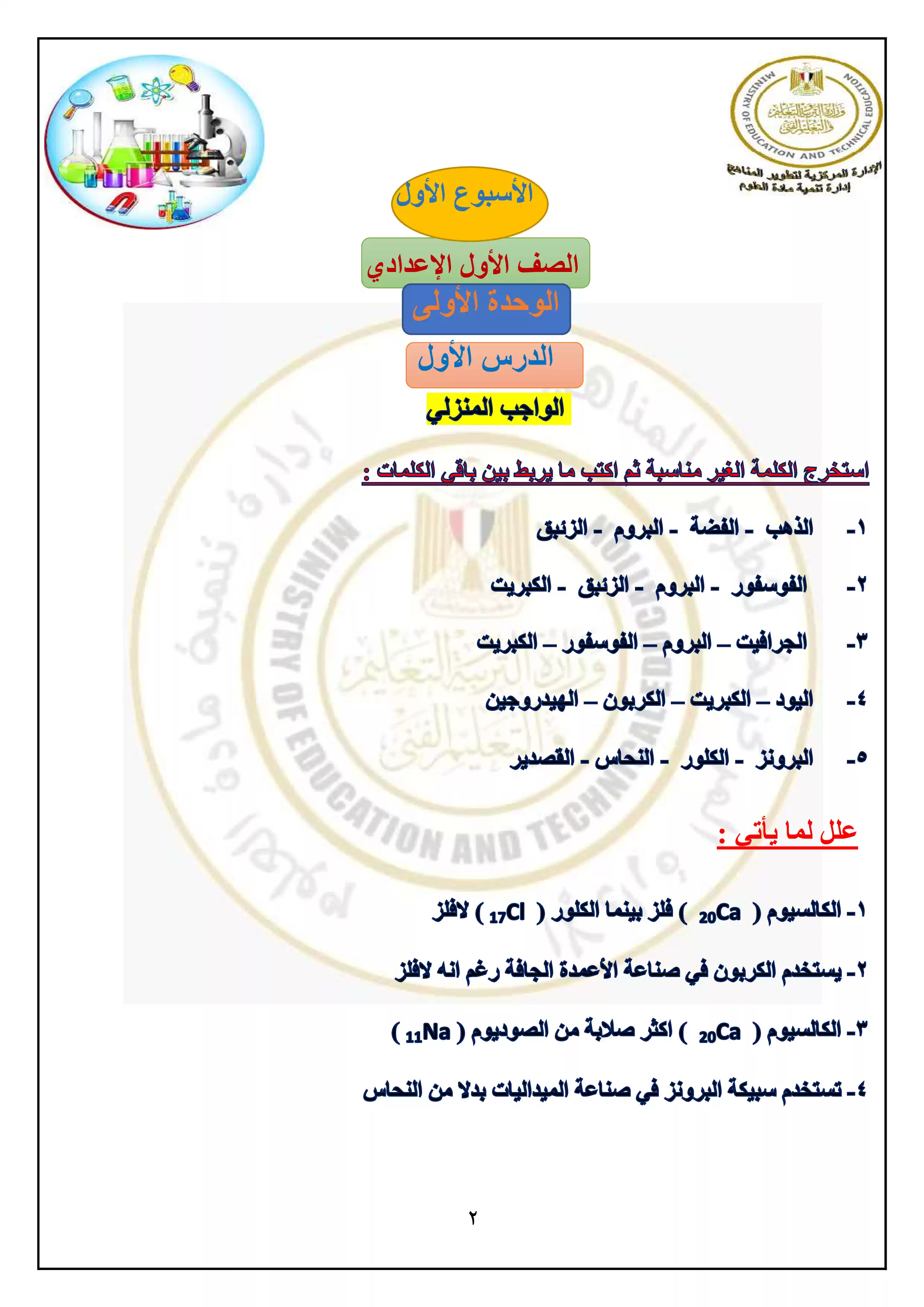• الواجب المنزلي للأسبوع الأول في العلوم للصف الأول الاعدادي الترم الثاني 2025