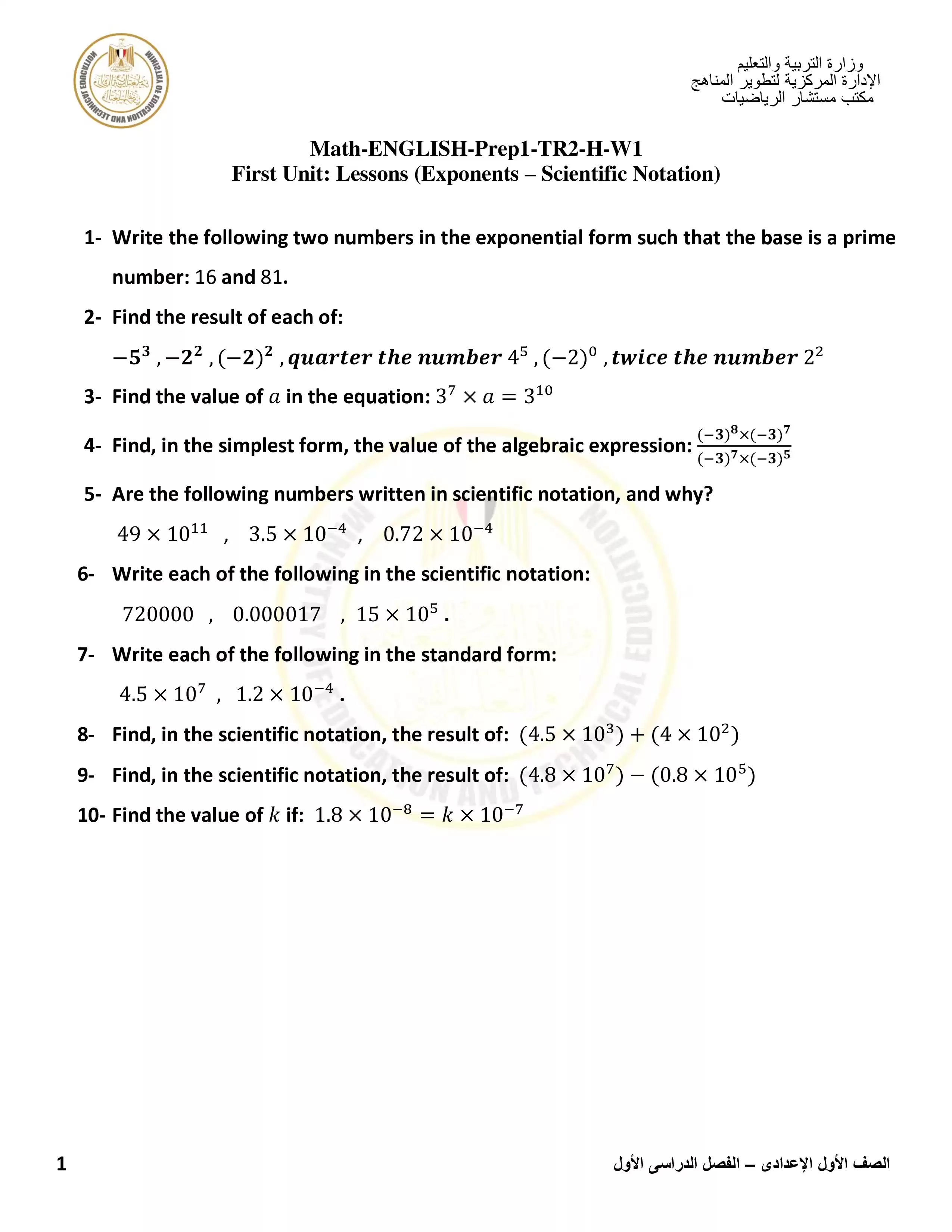 • الآداء المنزلي للصف الاول الاعدادي في الرياضيات باللغة الإنجليزية Math