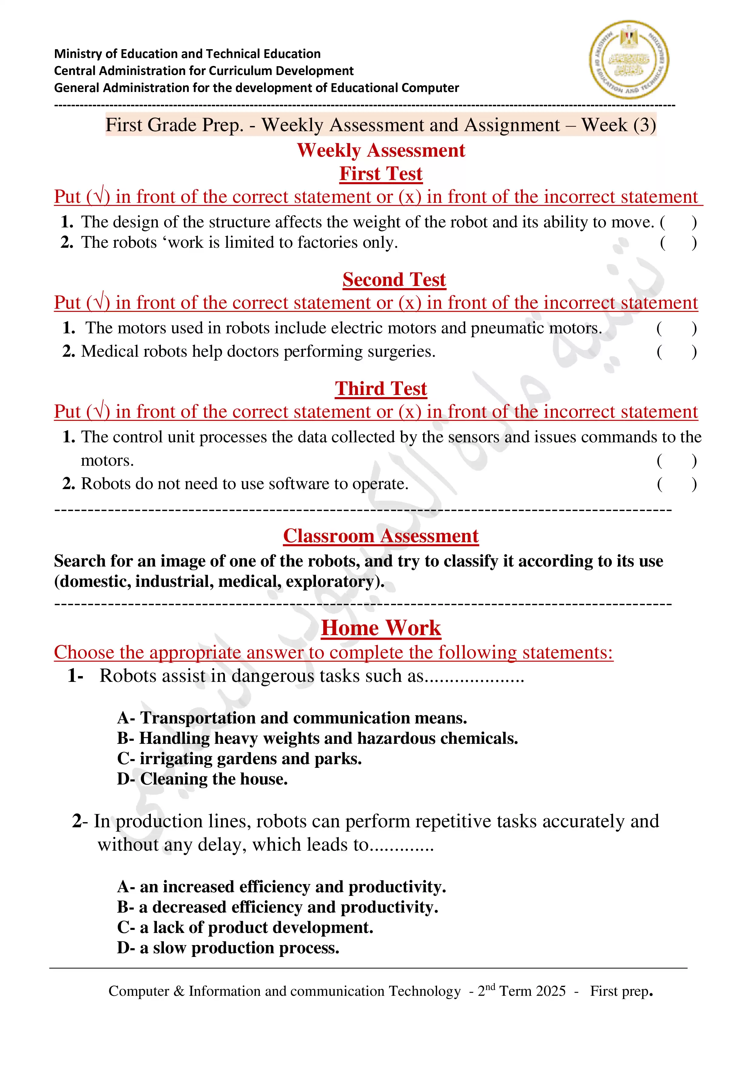 الصف الأول الإعدادي > تكنولوجيا المعلومات والاتصالات لغات ICT > الأداء المنزلي في الأسبوع الثالث مادة الكمبيوتر وتكنولوجيا المعلومات للغات ICT للصف الاول الاعدادي الترم الثاني 2025 بصيغة PDF