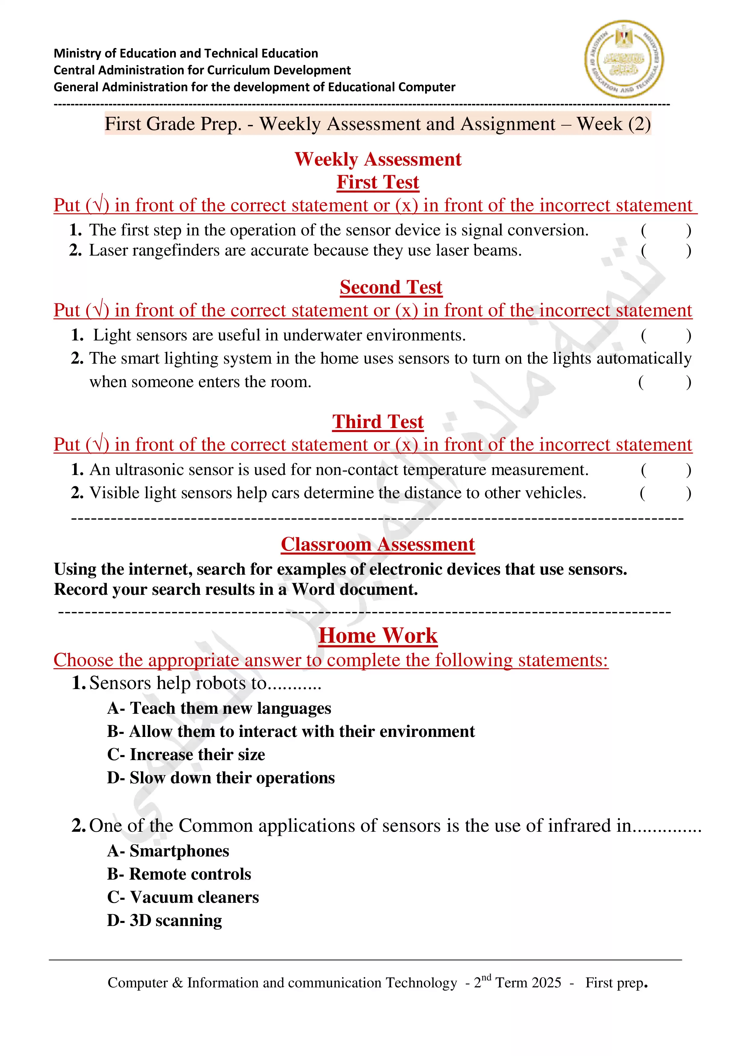 الصف الأول الإعدادي > تكنولوجيا المعلومات والاتصالات لغات ICT > الأداء المنزلي في الأسبوع الثاني مادة الكمبيوتر وتكنولوجيا المعلومات للغات ICT للصف الاول الاعدادي الترم الثاني 2025 بصيغة PDF