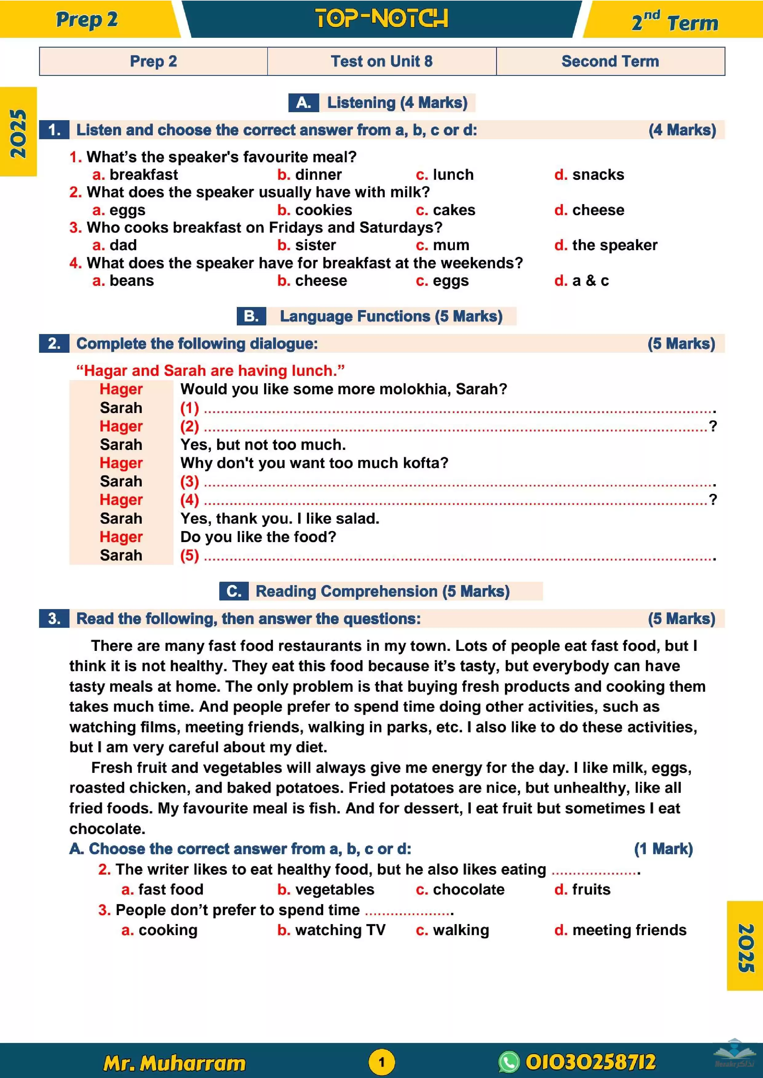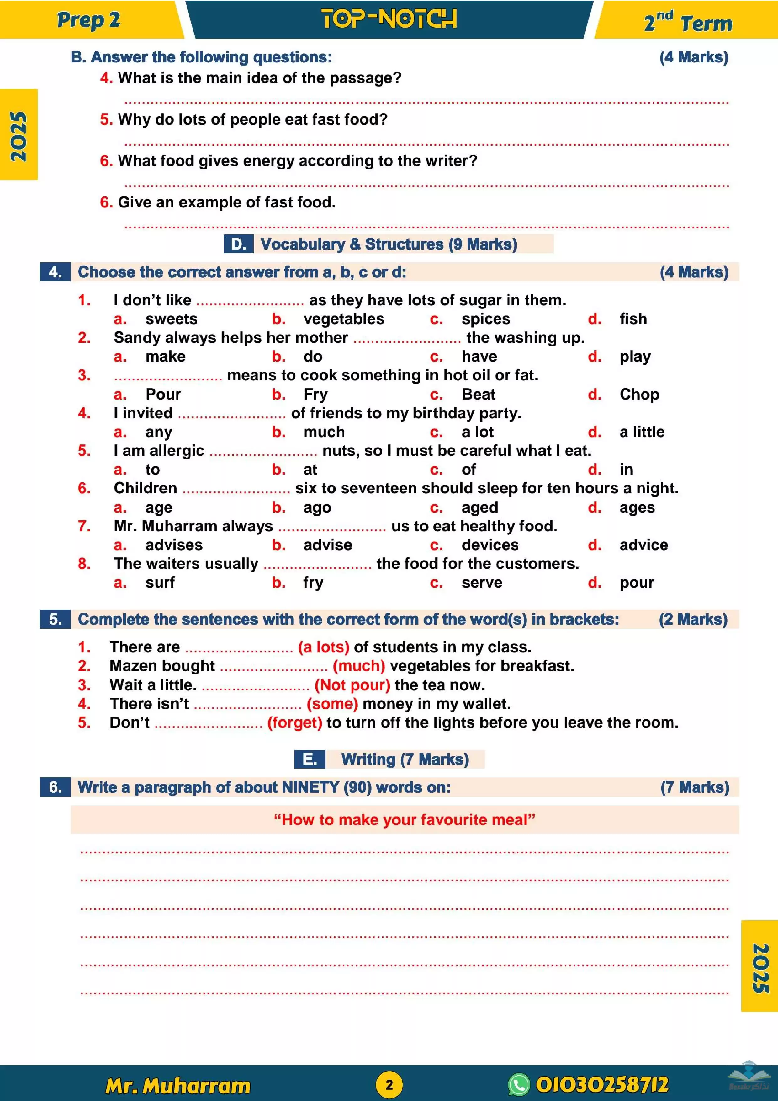 - امتحان لغة انجليزية لثانية اعدادي على الوحدة الثامنة