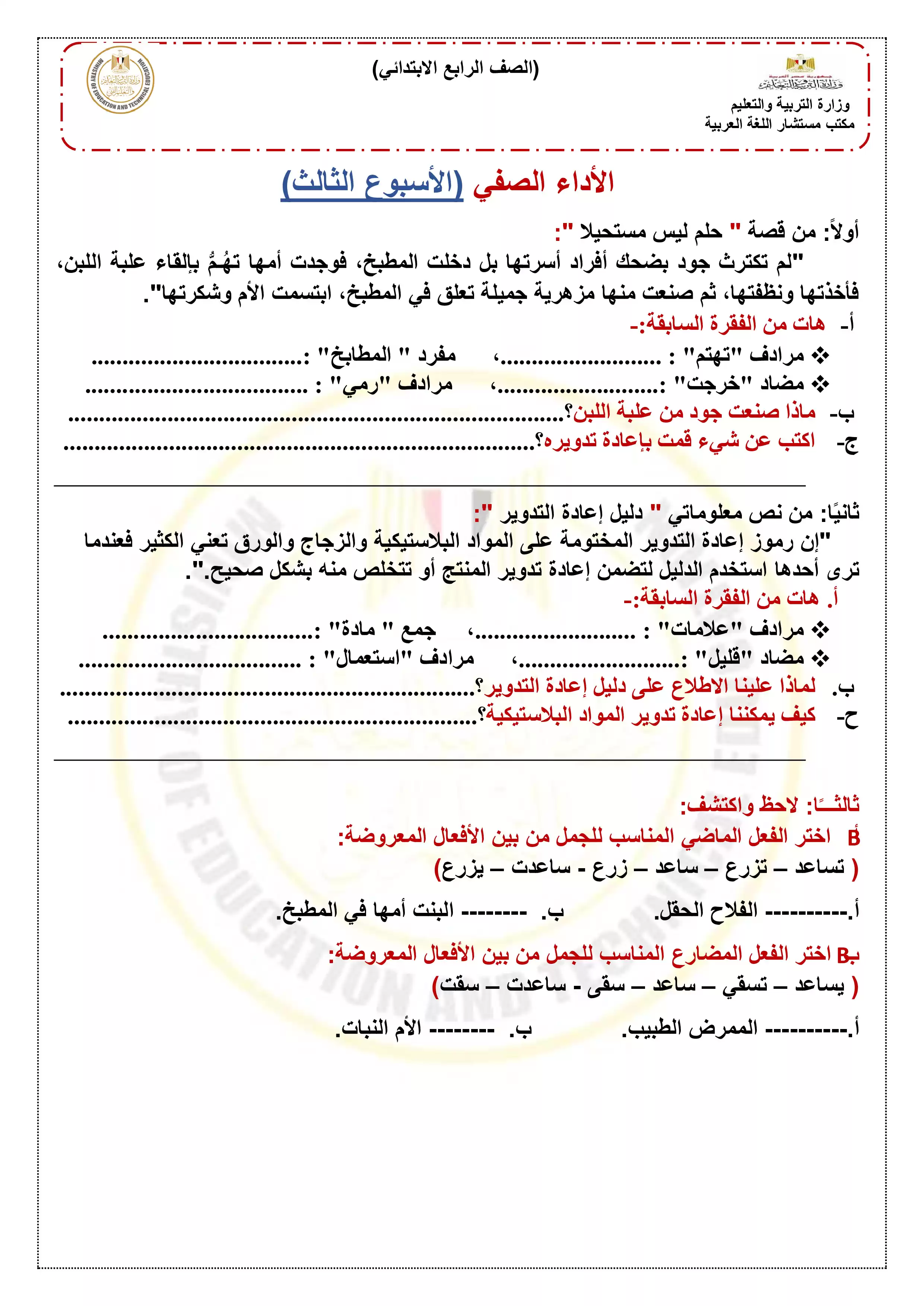 الآداء الصفي في الأسبوع الثالث مادة العربي للصف الرابع الإبتدائي الترم الثاني 2025 بصيغة PDF
